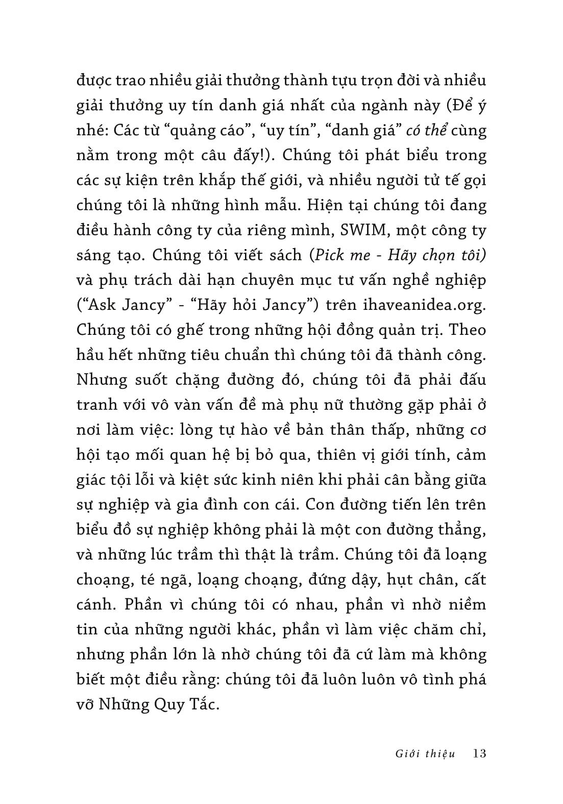 Tất nhiên chuyện đó không dễ dàng. Với vai trò là hai phụ nữ thành công trong tập đoàn quốc tế lớn, các tác giả chia sẻ những trải nghiệm có thực trong cuộc đời đi làm của mình, và đúc rút thành những lời khuyên cho người đi sau. Họ nhìn ra những "quy tắc" ngầm trong thế giới vẫn chưa hoàn toàn bình đẳng giới, và chỉ dẫn người phụ nữ hãy biết lên tiếng bày tỏ ý kiến của mình, thương lượng quyền lợi của mình một cách hiệu quả, hãy làm việc đúng khả năng, và đừng vì sợ hãi mà chối bỏ thiên chức lẫn niềm vui làm mẹ.