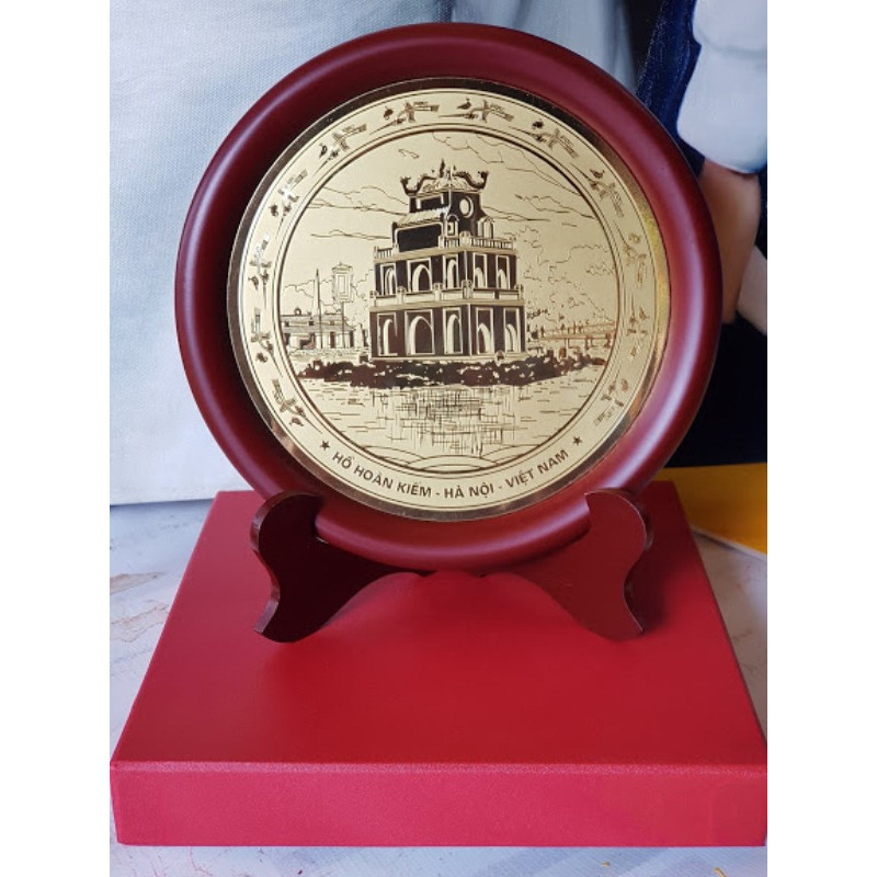 Sản phẩm tranh Tháp Rùa Hồ Gươm có chân để bàn phù hợp cho món quà tặng lưu niệm bền đẹp đầy ý nghĩa. Chất liệu được làm từ đồng vàng nguyên chất, viền khung và chân bằng gỗ, hộp giấy lụa. Nhận đặt hàng làm quà tặng lưu niệm với số lượng lớn. Kích thước đãi 20*20cm