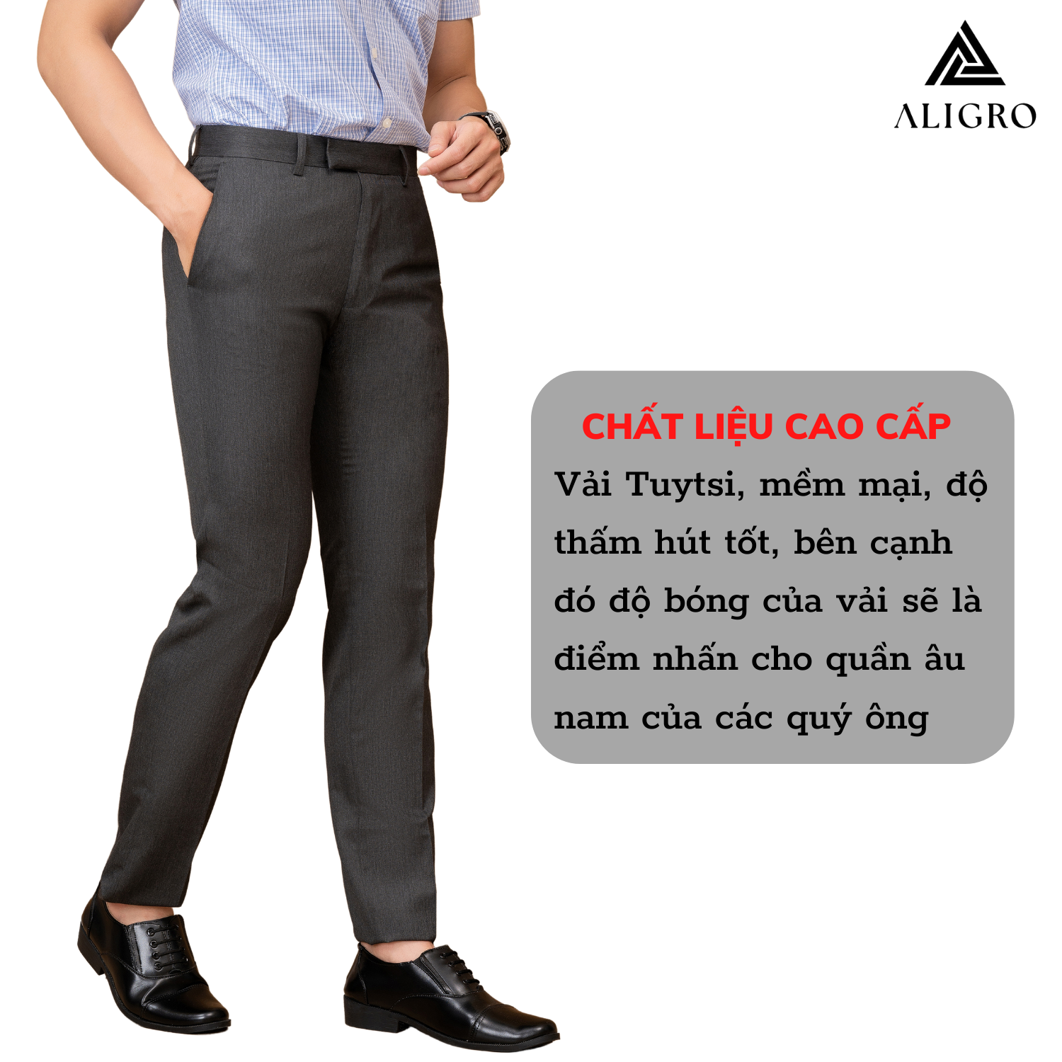 - GIỚI THIỆU THƯƠNG HIỆU Mang trong mình tầm nhìn chiến lược trở thành thương hiệu “Thời trang nam được yêu thích nhất Việt Nam” nên Aligro luôn chú trọng nghiên cứu phát triển mẫu mã, phom dáng phù hợp với vóc dáng hình thể đàn ông Việt. Sản phẩm của chúng tôi mang tới hình ảnh trẻ trung, năng động, hiện đại mà không kém phần lịch sự, sang trọng - cam kết mang lại giá trị đích thực và một cuộc sống thịnh vượng hơn cho phái mạnh Việt. CHI TIẾT THIẾT KẾ QUẦN ÂU QUẦN TÂY NAM ALIGRO