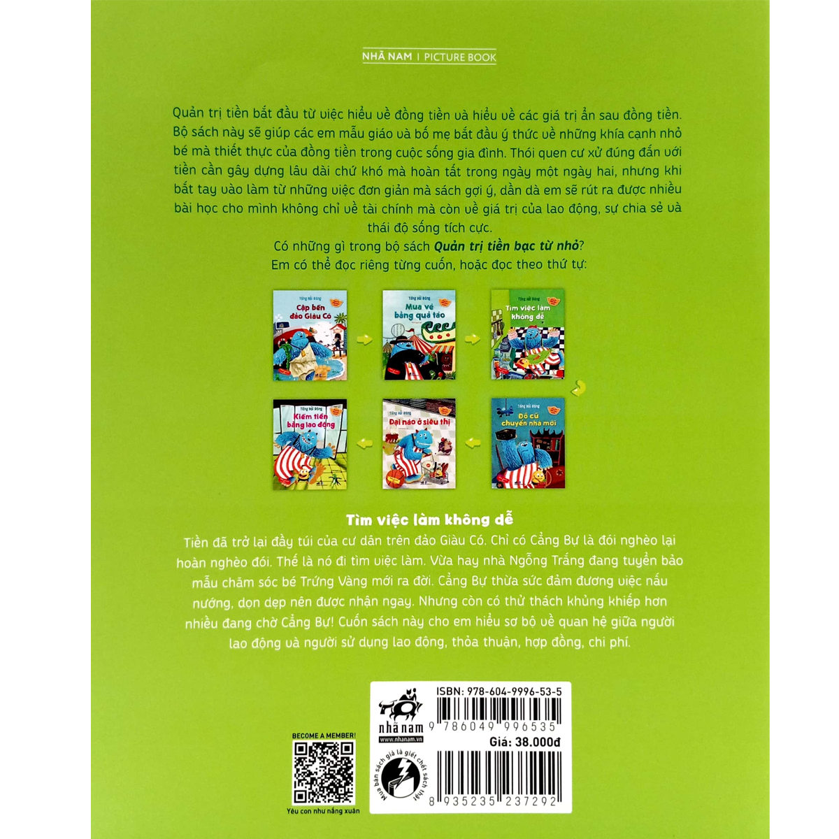 Quản Trị Tiền Bạc Từ Nhỏ - Tìm Việc Làm Không Dễ Giới thiệu tác phẩm Tiền đã trở lại đầy túi của cư dân trên đảo Giàu có. Chỉ có Cẳng bự là đói nghèo lại hoàn nghèo đói. Thế là nó đi tìm việc làm. Vừa hay nhà Ngỗng trắng đang tuyển bảo mẫu chăm sóc bé Trứng vàng mới ra đời. Cẳng bự thừa sức đảm đương việc nấu nướng, dọn dẹp nên được nhận ngay. Nhưng còn có thử thách khủng khiếp hơn nhiều đang chờ Cẳng bự! Cuốn sách này cho em hiểu sơ bộ về quan hệ giữa người lao động và người sử dụng lao động, thỏa thuận, hợp đồng, chi phí.