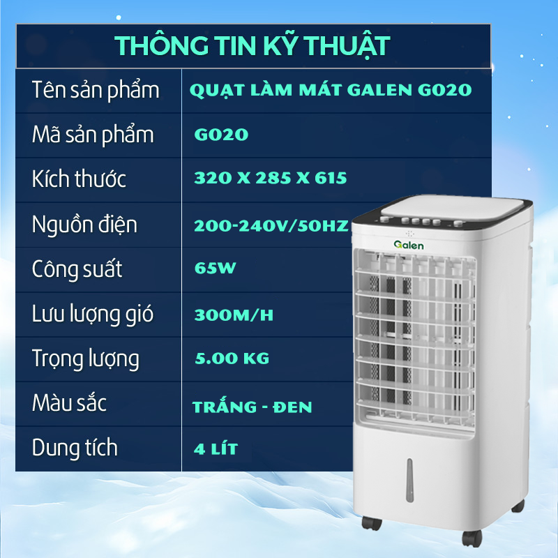 - Dung tích bình đựng nước của quạt làm mát không khí chiếm đến 4L, với chu trình làm mát nhiệt độ tỏa ra ngoài sẽ giảm xuống từ 4-5 độ C. Quạt làm mát không khí Galen G020 còn có thể tạo độ lạnh bằng cách tăng cường bằng viên đá khô được tặng kèm.