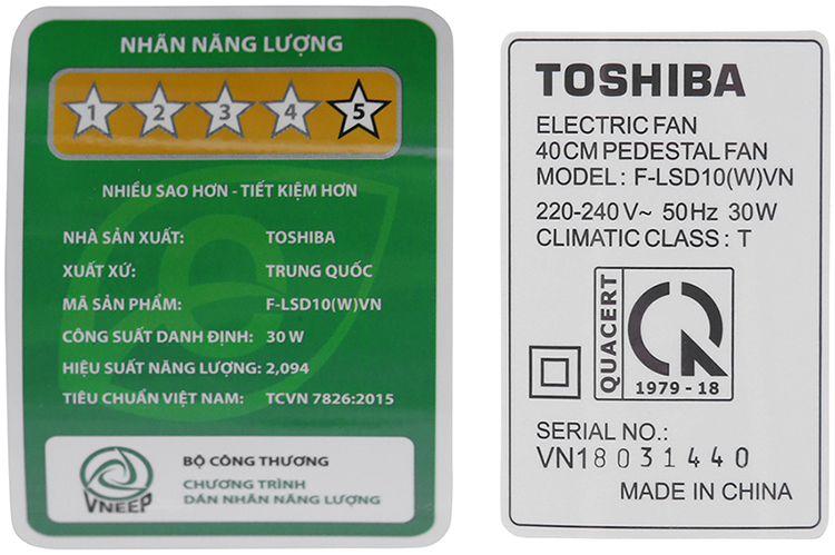 Thiết kế hiện đại Quạt đứng Toshiba F-LSD10(W)VN sở hữu thiết kế hiện đại kết hợp màu sắc tinh tế, phù hợp với nhiều không gian nội thất. Kiểu dáng cao gọn, không chiếm quá nhiều diện tích giúp bạn vừa có được không khí mát mẻ và vẫn đảm bảo sự gọn gàng, tiện dụng. Màn hình hiển thị LED chiếu sáng dễ nhìn, tiện lợi cho mọi người sử dụng ngay cả vào ban đêm. Màn hình sẽ tự động tắt sau 30 giây, không gây chói mắt vào ban đêm.  Luồng gió mạnh mẽ, vận hành êm ái Cánh quạt được thiết kế độc đáo từ 7 - 9 cánh tạo luồng gió nhiều, mạnh mẽ, giúp thổi gió mát và xa hơn cho bạn thoải mái ở bất cứ không gian nào, phù hợp sử dụng trong gia đình có diện tích lớn hoặc tại quán ăn, cửa hàng kinh Động cơ vận hành êm ái, không tạo ra tiếng ồn khó chịu, động cơ có tính bền bỉ cao. Công nghệ Inverter Thiết kế cánh quạt độc đáo cùng động cơ DC Inverter tiên tiến mạnh mẽ giúp luồng gió thổi mạnh hơn, xa hơn nhưng vận hành vẫn nhẹ nhàng, êm ái. Quạt Toshiba tiết kiệm điện tối ưu nhờ động cơ DC sử dụng dòng điện một chiều có giao thoa điện từ cực nhỏ giúp tiết kiệm đến 70% điện năng.