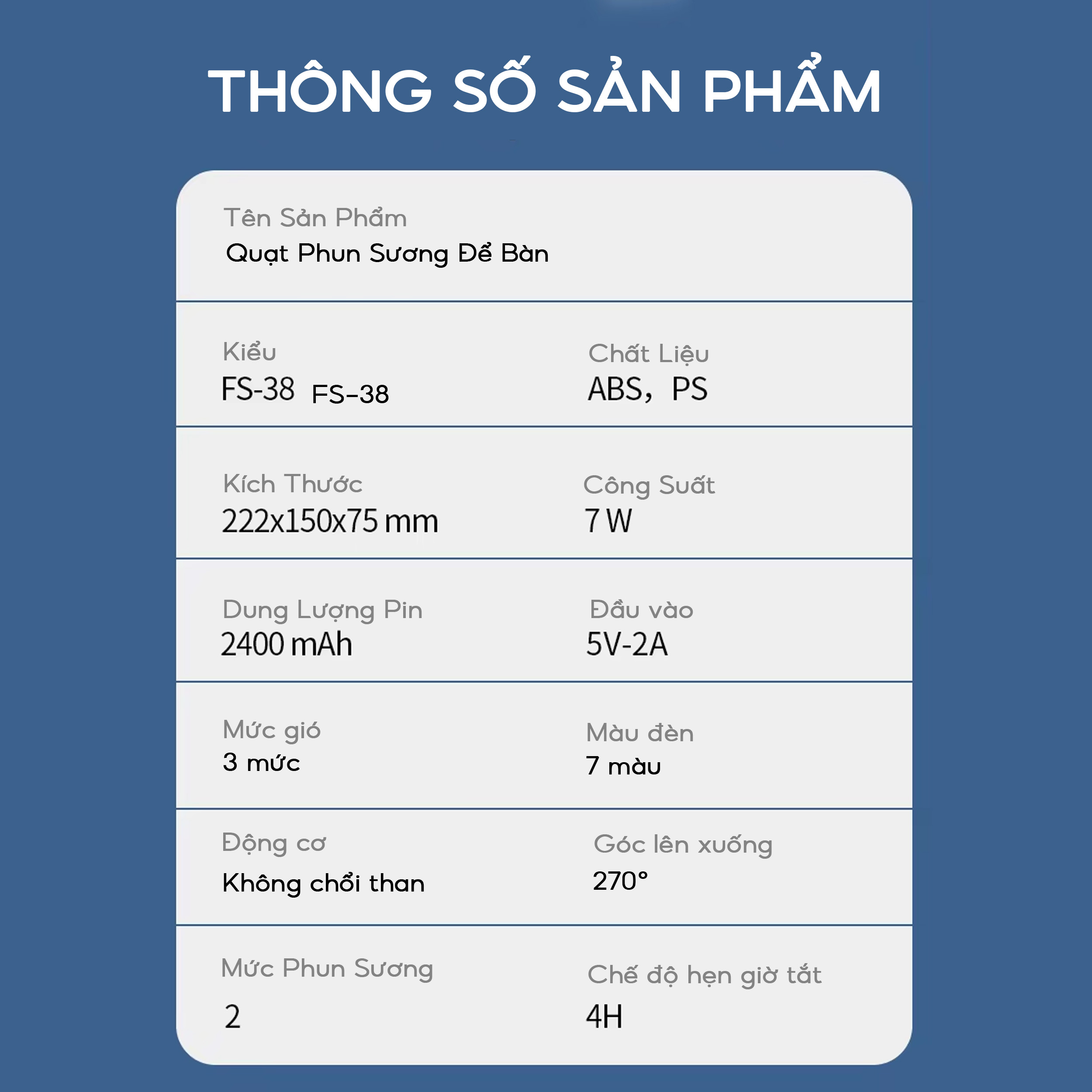 Quạt phun sương để bàn nhỏ gọn tiện lợi có 5 vòi phun sương quạt hơi nước kèm đèn led 7 màu tùy chỉnh có chế độ hẹn giờ cùng 3 chế độ phun sương