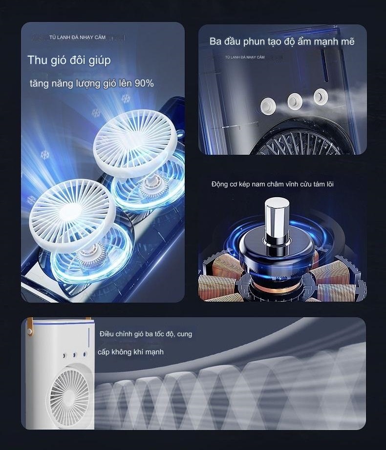 - Dung tích bình nước: 45L - Lưu lượng gió: 5.500m3/h - Kích thước: 470mm x 380mm x 990mm - Điện Áp: AC 220v-240V/50Hz - Công suất: 90W - Trọng lượng : 14.5 Kg