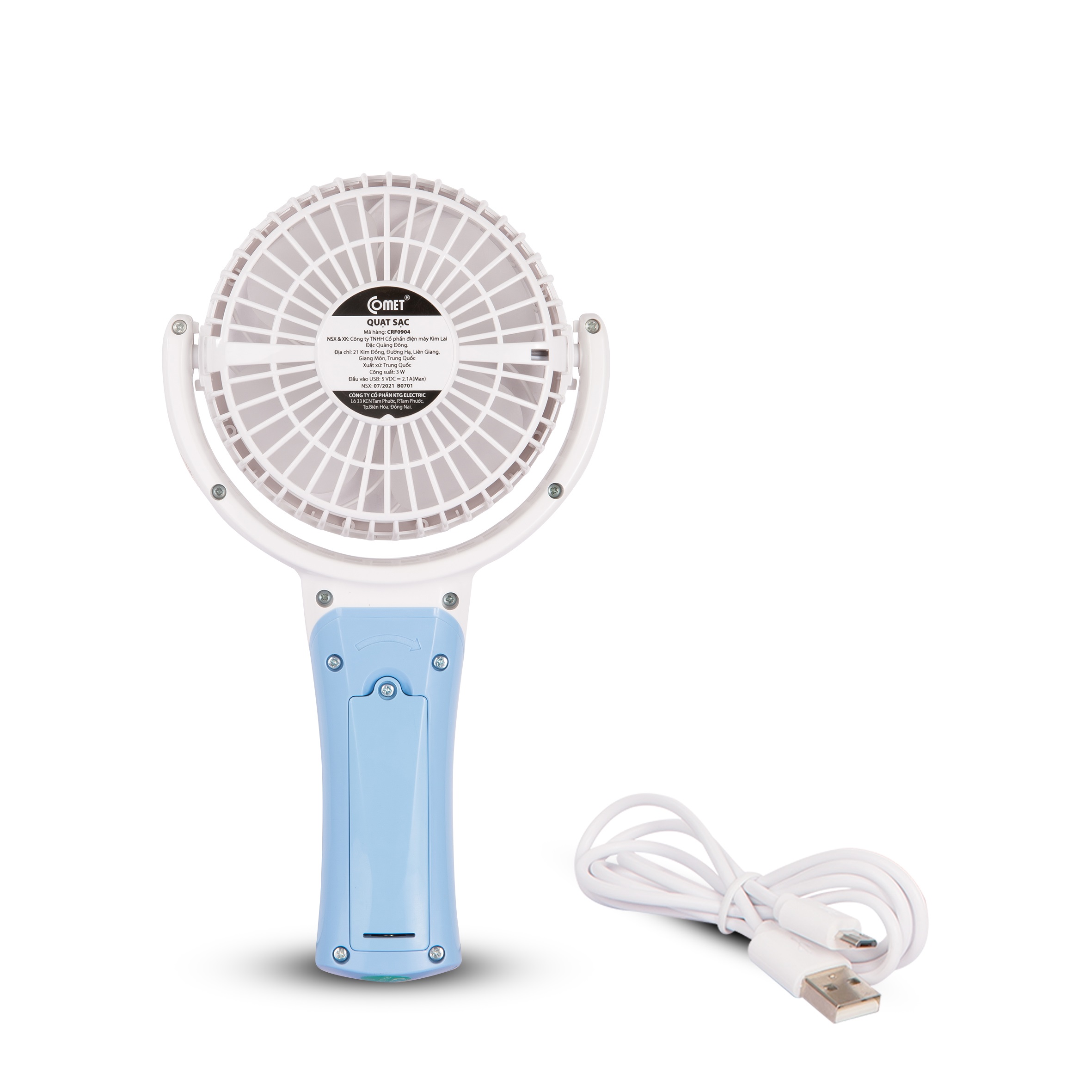 Quạt sạc Comet có cổng sạc bằng đầu USB, dễ dàng sạc lại cho quạt bằng cách cắm trực tiếp cổng sạc USB vào máy tính. Bạn có thể sạc pin cho quạt bằng cục sạc dự phòng của điện thoại ngay khi đi du lịch hoặc sạc cho quạt trực tiếp bằng điện.