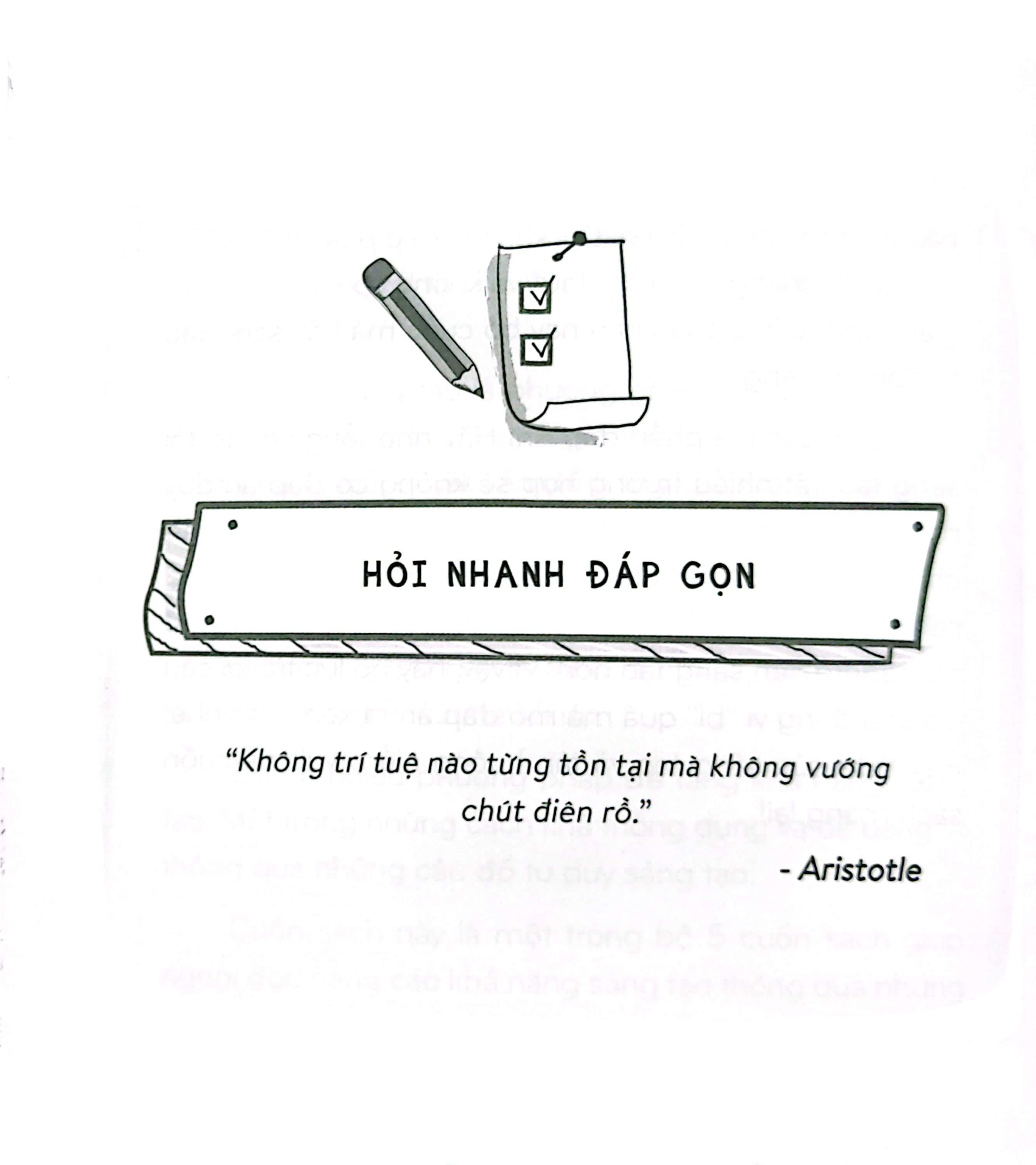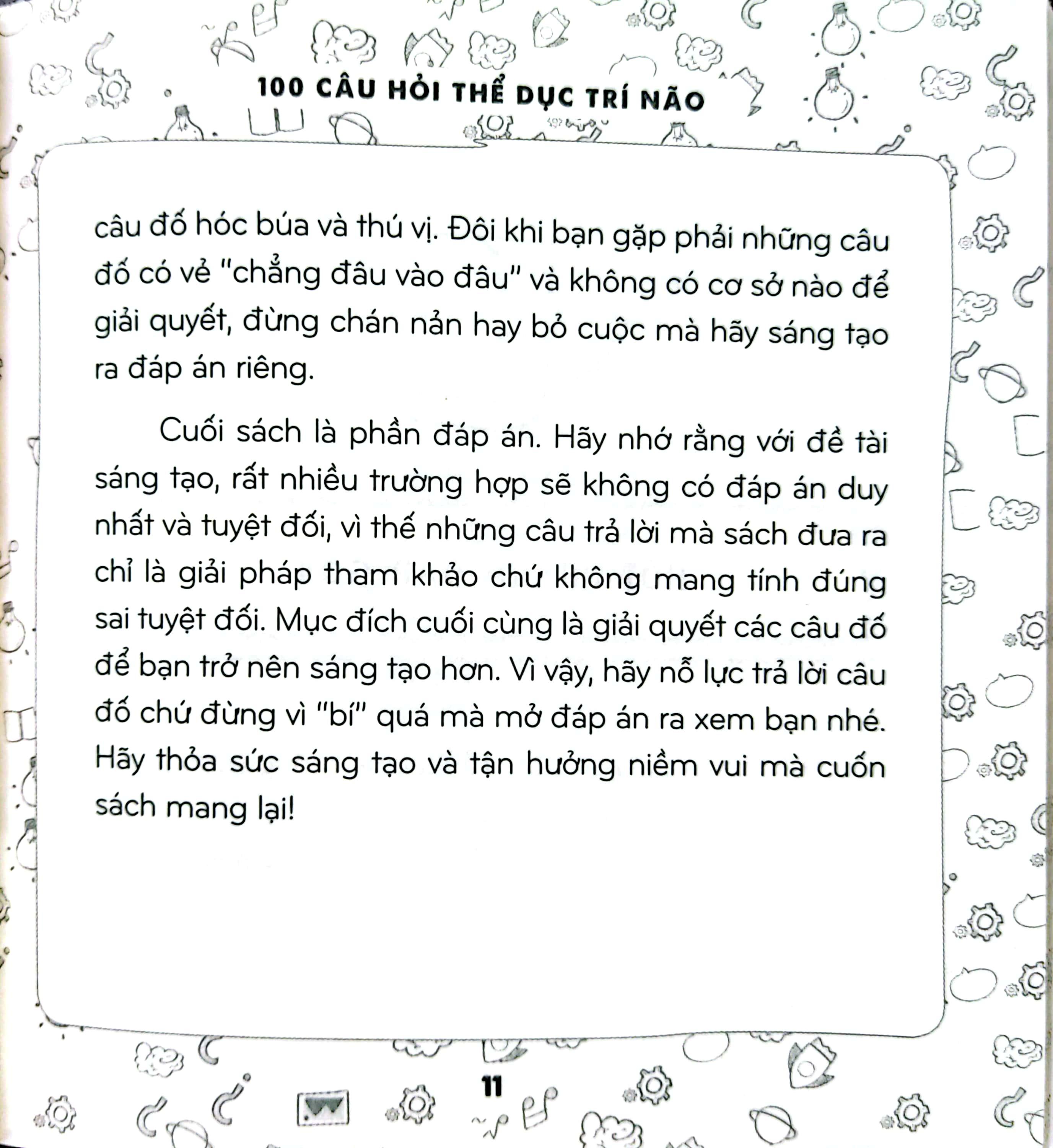 Cuối sách là phần đáp án. Hãy nhớ rằng với đề tài sáng tạo, rất nhiều trường hợp sẽ không có đáp án duy nhất và tuyệt đối, vì thế những câu trả lời mà sách đưa ra chỉ là giải pháp tham khảo chứ không mang tính đúng sai tuyệt đối. Mục đích cuối cùng là giải quyết các câu đố để bạn trở nên sáng tạo hơn. Vì vậy, hãy nỗ lực trả lời câu đố chứ đừng vì “bí” quá mà mở ngay đáp án ra xem nhé. Hãy thỏa sức sáng tạo và tận hưởng niềm vui mà cuốn sách mang lại!