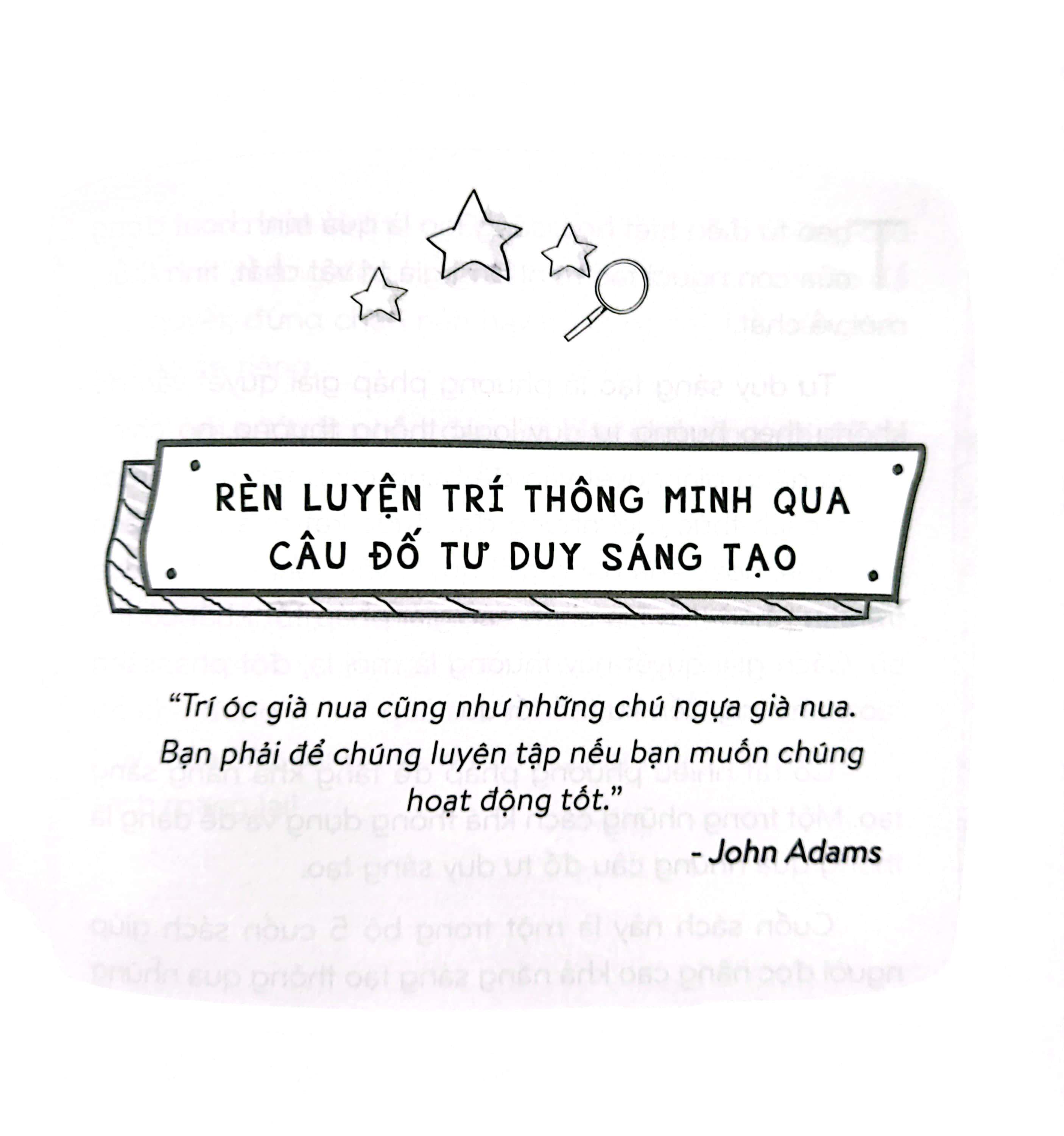 Mỗi cuốn sách gồm 100 câu hỏi được thiết kế đa dạng, phát triển nhiều loại hình trí thông minh và giúp người đọc nâng cao khả năng sáng tạo thông qua những câu đố hóc búa và thú vị. Đôi khi bạn gặp phải những câu đố có vẻ “chẳng đâu vào đâu” và không có cơ sở nào để giải quyết, đừng chán nản hay bỏ cuộc mà hãy sáng tạo ra đáp án riêng.