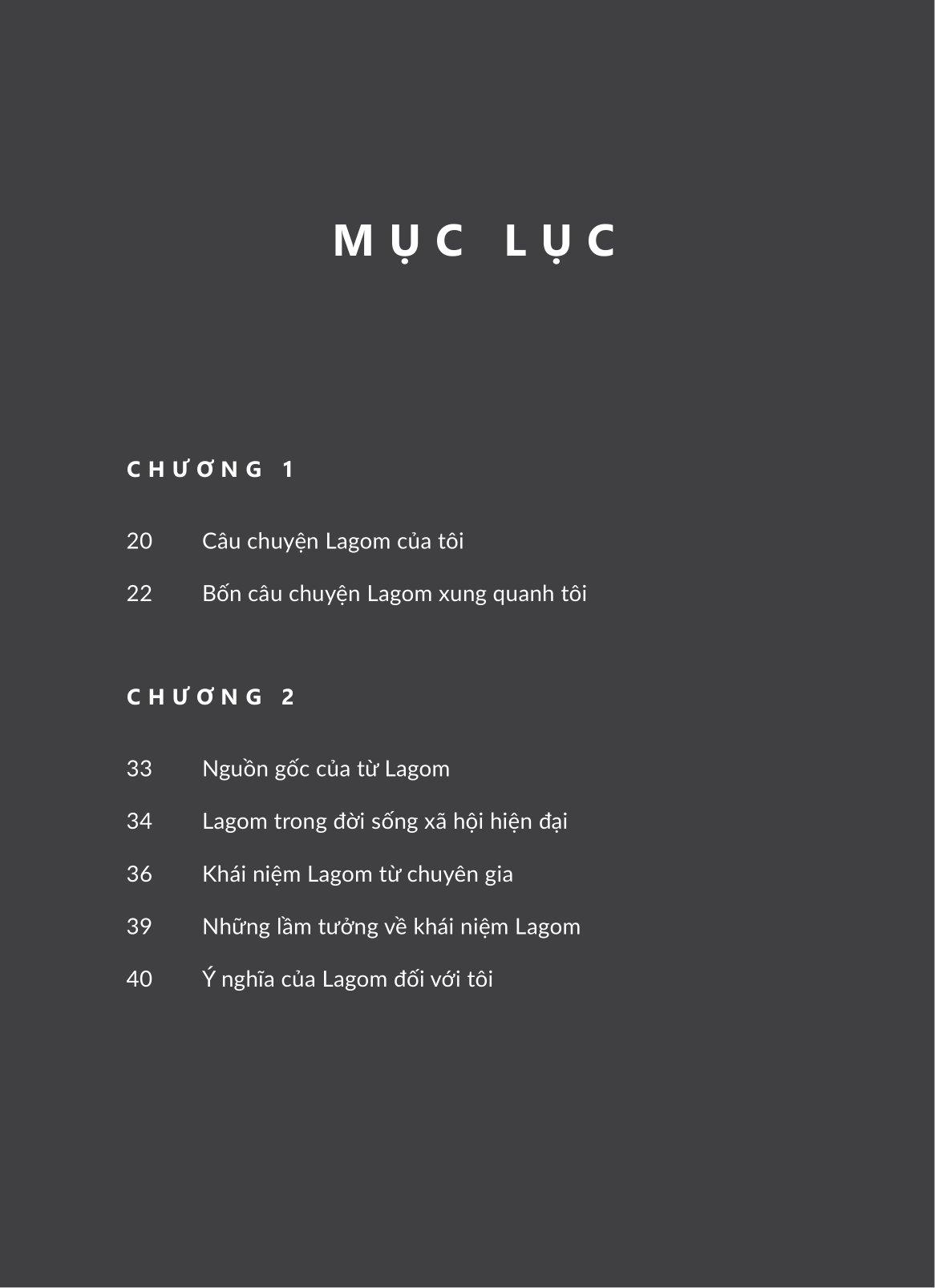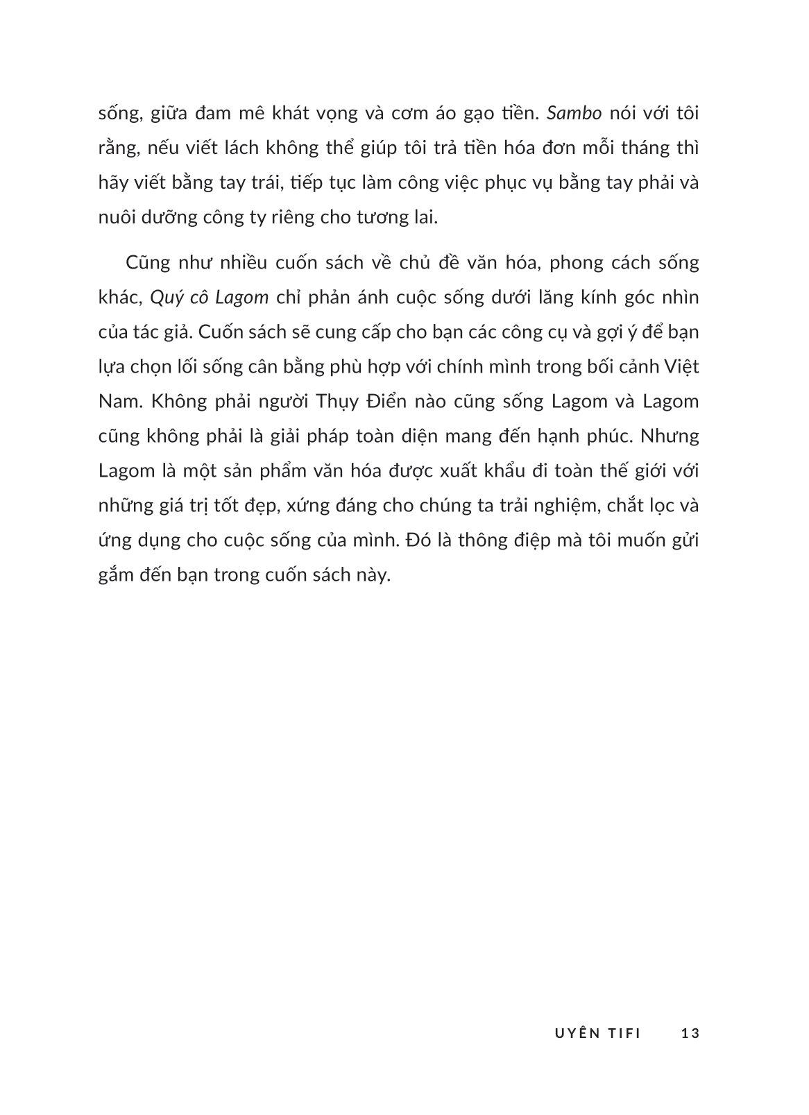 Dù bạn đã từng nghe đến hay còn xa lạ với Lagom thì cuốn sách này vẫn hứa hẹn đem đến cho bạn một góc nhìn rất khác về phong cách sống của người Bắc Âu - nơi được mệnh danh là “Vương quốc Hạnh phúc”. Theo chân hành trình sống, quan sát và chiêm nghiệm của tác giả Uyên Tifi cùng những người bản xứ, cuốn sách đi từ những khái niệm cơ bản nhất của Lagom đến việc ứng dụng triết lý này để đạt được sự cân bằng viên mãn thông qua 7 khía cạnh tiêu biểu: xây dựng sự nghiệp, in dấu cá nhân qua thời trang, chế độ ăn uống lành mạnh, gìn giữ hạnh phúc gia đình, rèn luyện thể chất và tinh thần, quản lý tài chính và bảo vệ môi trường bền vững.