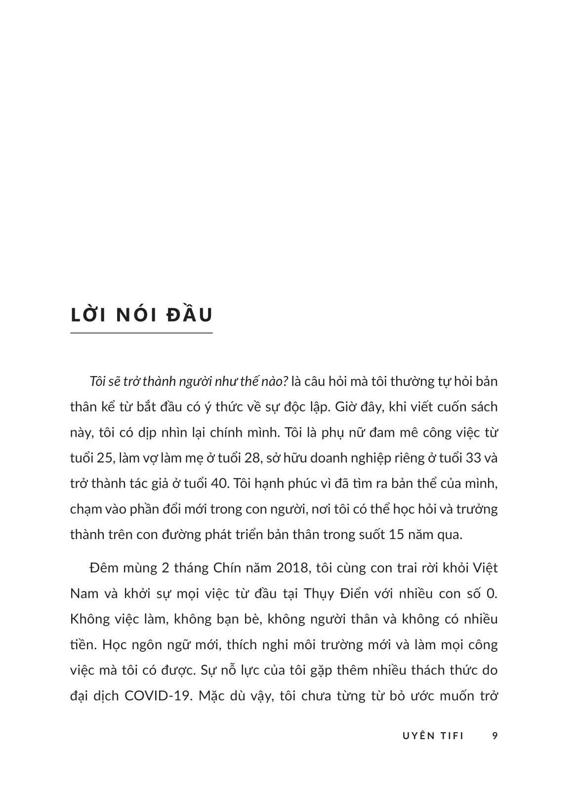 Tốt nghiệp Cao học tại Đại học Paris Créteil (Pháp), tác giả Uyên Tifi từng đảm nhiệm nhiều vị trí quản lý cấp cao trước khi định cư tại Thụy Điển năm 2018. Hiện tại cô không chỉ kinh doanh dịch vụ tư vấn, kết nối thương mại, khởi nghiệp và ươm tạo doanh nghiệp mà còn tạo ra những kết nối giá trị đồng thời truyền cảm hứng sống hạnh phúc cho phụ nữ.