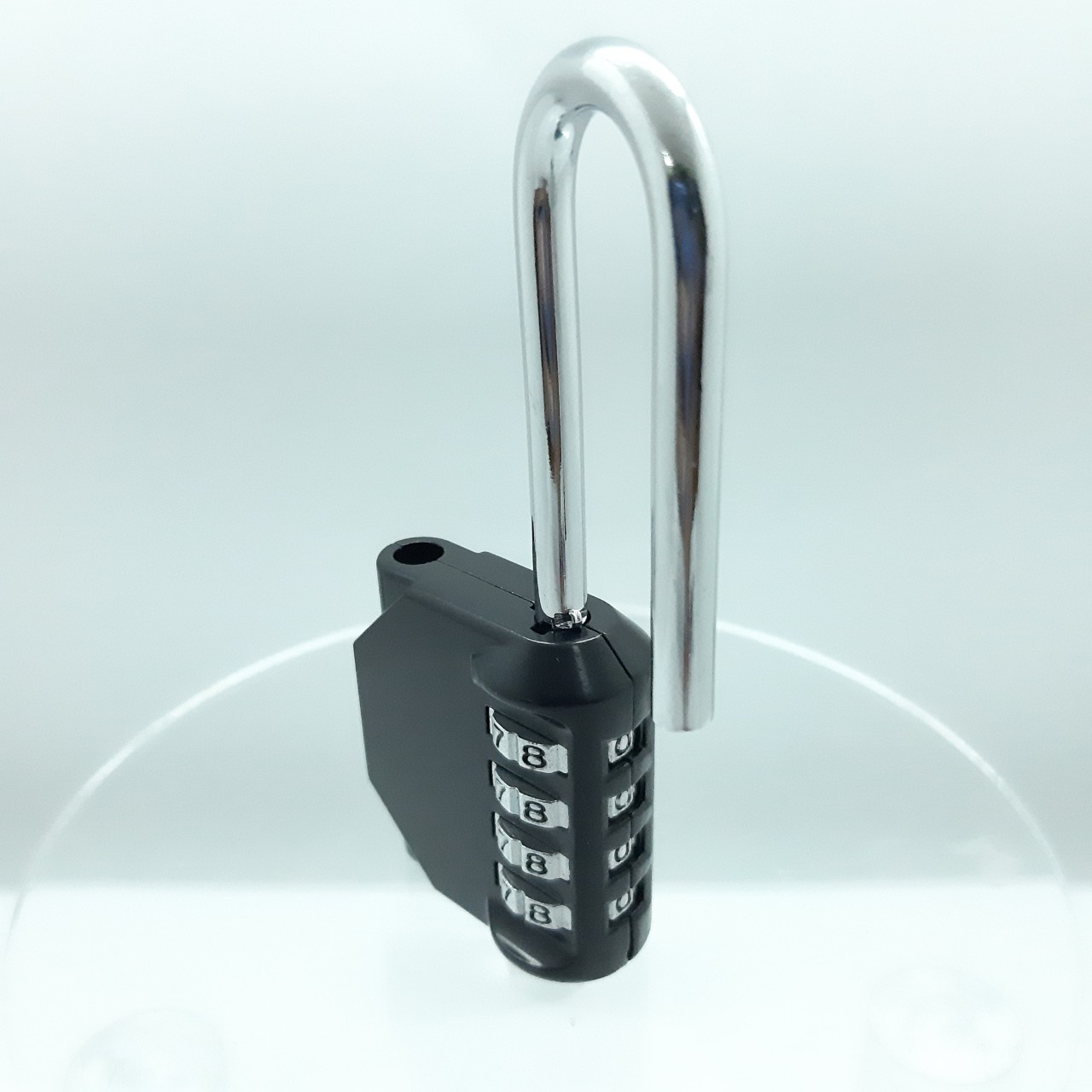 Càng khóa bằng thép, dài 52mm, bề ngang 20mm,Đường kính 6mm Thân khóa bằng hợp kim chống gỉ, Chế độ mở khóa bằng mật mã 4 số, có thể thiết lập đến 9999 mã khóa khác nhau; khóa lại bằng cách đóng móc và xoay mã số. Bề mặt sơn màu đen, mang lại cảm giác cứng cáp, kết hợp với móc và phím màu bạc vô cùng sang trọng Phím mật mã xoay nhẹ nhàng Chế độ thay đổi mã bằng cách đổi chiều móc khóa, nhấn móc đồng thời đổi mã, dễ dàng sử dụng và thiết lập, tiện dụng