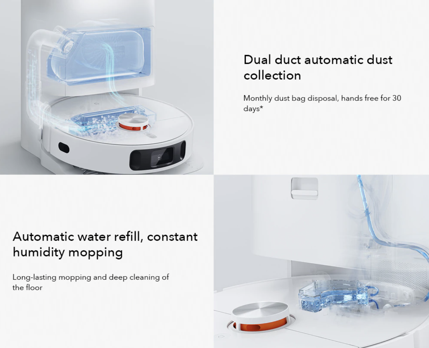 Với kết cấu ống gió, thì sau khi hoàn thành công việc, Robot hút bụi Xiaomi sẽ tự động quay lại Dock để tiến hành dọn dẹp hộc chứa bụi. Được trang bị cơ chế hút bụi với chu kỳ ống dẫn khí kép cho phép máy hút sạch bụi trong robot trong vòng 10 giây. Đồng thời với túi chứa bụi dung tích 2.5L tích hợp, cho phép người dùng có thể tích trữ lượng bụi và rác trong vòng 30 ngày. Để hỗ trợ vệ sinh hiệu quả nhất, người dùng có thể tháo rời khay vệ sinh dễ dàng để hỗ trợ người dùng lau dọn và bảo trì.