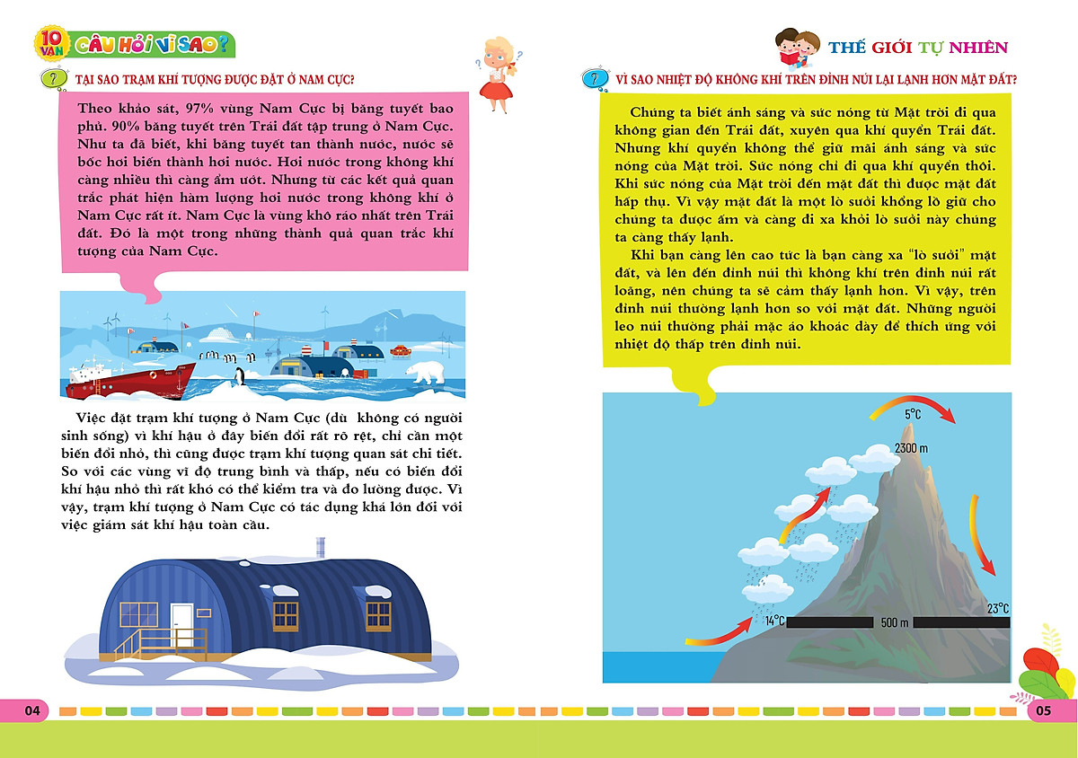Trẻ em luôn tò mò và muốn tìm hiểu thêm về thế giới và những điều kỳ lạ xung quanh. Bé sẽ đặt rất nhiều những câu hỏi như "Vì sao?" với mong muốn được giải đáp. Bộ sách 10 vạn câu hỏi vì sao sẽ có câu trả lời cho các câu hỏi của bé xoay quanh chủ đề quen thuộc như Cuộc sống quanh ta, Ăn uống & Sức khỏe, Khám phá khoa học, Thế giới động vật, Thế giới tự nhiên. Bộ sách này sẽ là món quà tuyệt vời và ý nghĩa dành cho các bé.