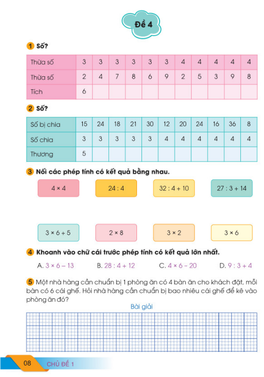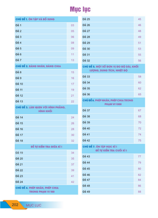 Bộ sách gồm 5 quyển, mỗi lớp 1 quyển. Các đề được biên soạn theo từng chủ đề để giúp học sinh hệ thống hóa kiến thức trong các bài ở mỗi chủ đề. Giữa kì và cuối kì đều có các đề ôn luyện, giúp các em có kiến thức vững vàng khi bước vào kì thi và đạt kết quả tốt. Mỗi đề gồm 6 đến 8 bài toán có nội dung bám sát từng chủ đề trong sách giáo khoa, với các mức độ từ dễ đến khó để kiểm tra, đánh giá được năng lực của học sinh. Giáo viên có thể dùng để cho học sinh làm bài tập trong buổi 2, cuối tuần hoặc dùng làm dễ ôn tập kiểm tra giữa kì, cuối kì.