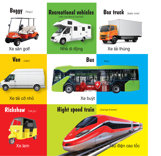Bộ sách gồm 4 cuốn: số đếm, động vật, phương tiện giao thông, bảng chữ cái màu sắc hình dạng