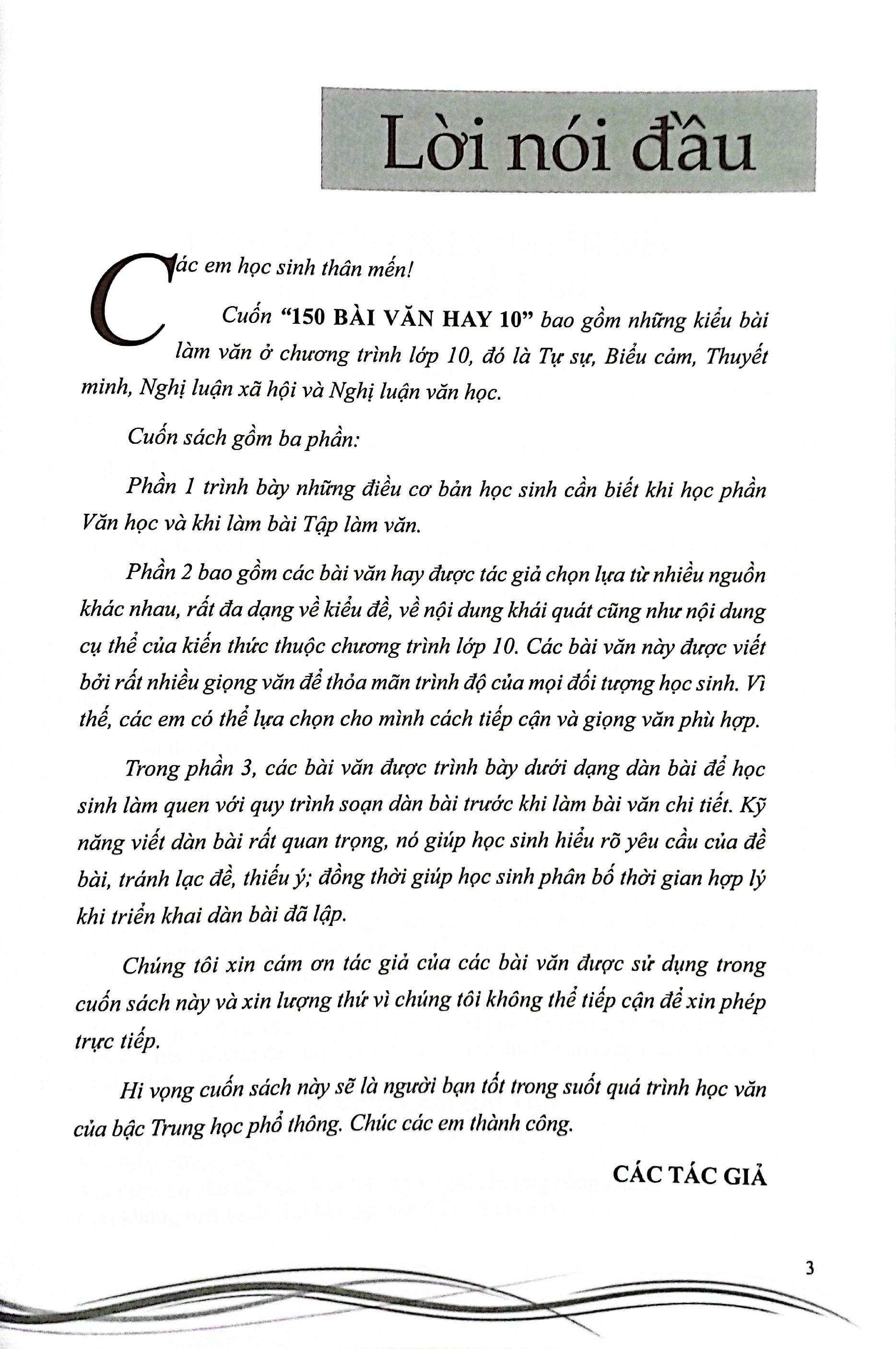 Cuốn “150 BÀI VĂN HAY 10” bao gồm những kiểu bài làm văn ở chương trình lớp 10, đó là Tự sự, Biểu cảm, Thuyết minh, Nghị luận xã hội và Nghị luận văn học.