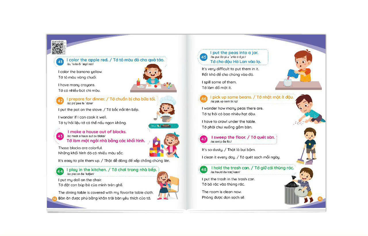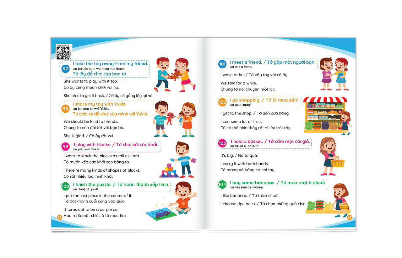 Sách 900 Câu Tiếng Anh Giao Tiếp Thường Dùng Hàng Ngày - Cẩm Nang Cho Mẹ Cùng Con Học Tiếng Anh Mỗi Ngày (Kèm File Nghe - Quét QR) GIỚI THIỆU SẢN PHẨM: Cuốn sách gồm 900 câu đàm thoại tiếng Anh để cha mẹ cùng con có thể giao tiếp về các chủ đề xung quanh cuộc sống hằng ngày, từ lúc thức dậy vào buổi sáng, đi học, đi chơi, đi siêu thị … cho đến lúc đi ngủ. Có cuốn sách này thì cha mẹ không lo bí từ, không biết nói tiếng Anh như thế nào cùng con. Đây là cuốn cẩm nang giúp cho cha mẹ có cơ hội học tập và giao tiếp tiếng Anh cùng con, để cả hai cùng tiến bộ mỗi ngày. Sách có kèm file nghe quét mã QR với giọng đọc tiếng Anh chuẩn để cha mẹ và con cùng nghe và tắm ngôn ngữ mỗi ngày. HƯỚNG DẪN BẢO QUẢN SÁCH THIẾU NHI: