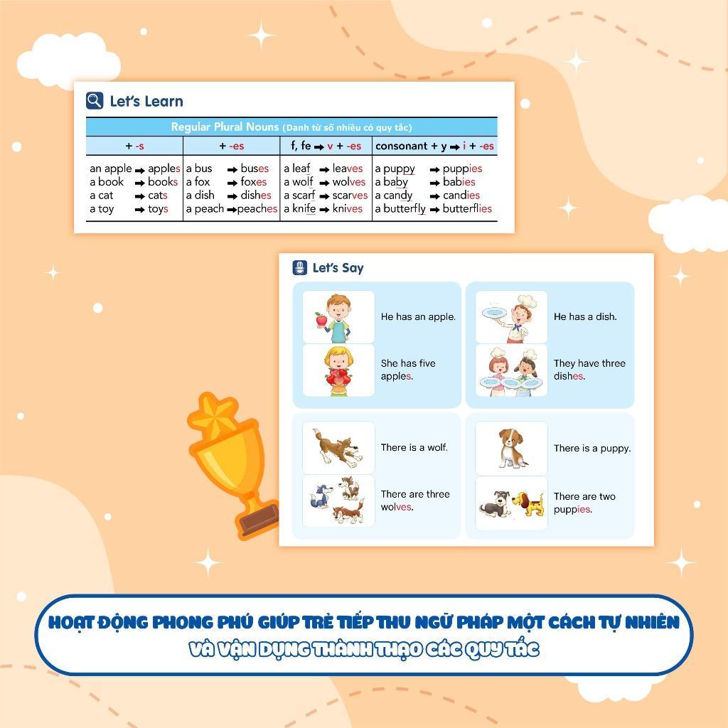 - Sách gồm 6 chương với 24 Unit, tổng hợp tất cả những chủ đề ngữ pháp hay nhất trong chương trình lớp 3 như: Danh từ & Mạo từ, Đại từ, động từ To-be, …Những kiến thức ngữ pháp nên tảng vững chắc đầu tiên này sẽ giúp con phát huy tối đa khả năng tiếng Anh khi lên những lớp cao hơn. ần thực hành cung cấp đa dạng các hoạt động, giúp các con tiếp cận từng bước với các quy tắc ngữ pháp. Các con có thể thực hành và tìm hiểu các quy tắc dử dụng ngữ pháp một cách chính xác.