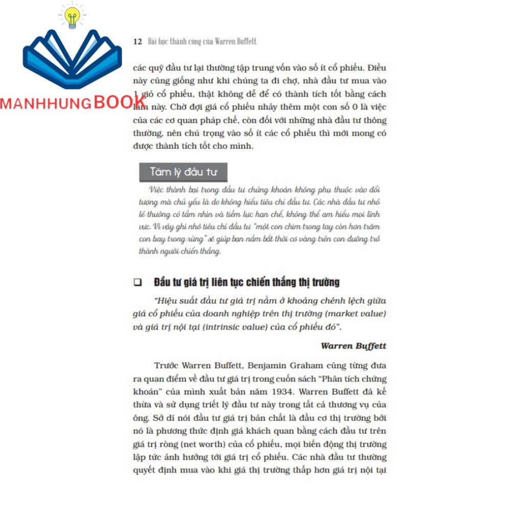 Cuốn sách "Bài học thành công của Warren Buffett"gồm 12 chương tương ứng với 12 bài học được đúc kết tiêu biểu cho các chiến lược đầu tư thực tiễn đã giúp ông thành công và trở thành nhà đầu tư vĩ đại.