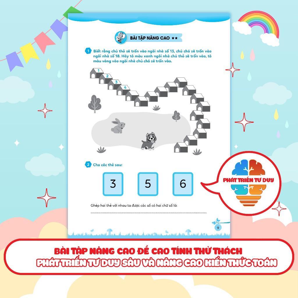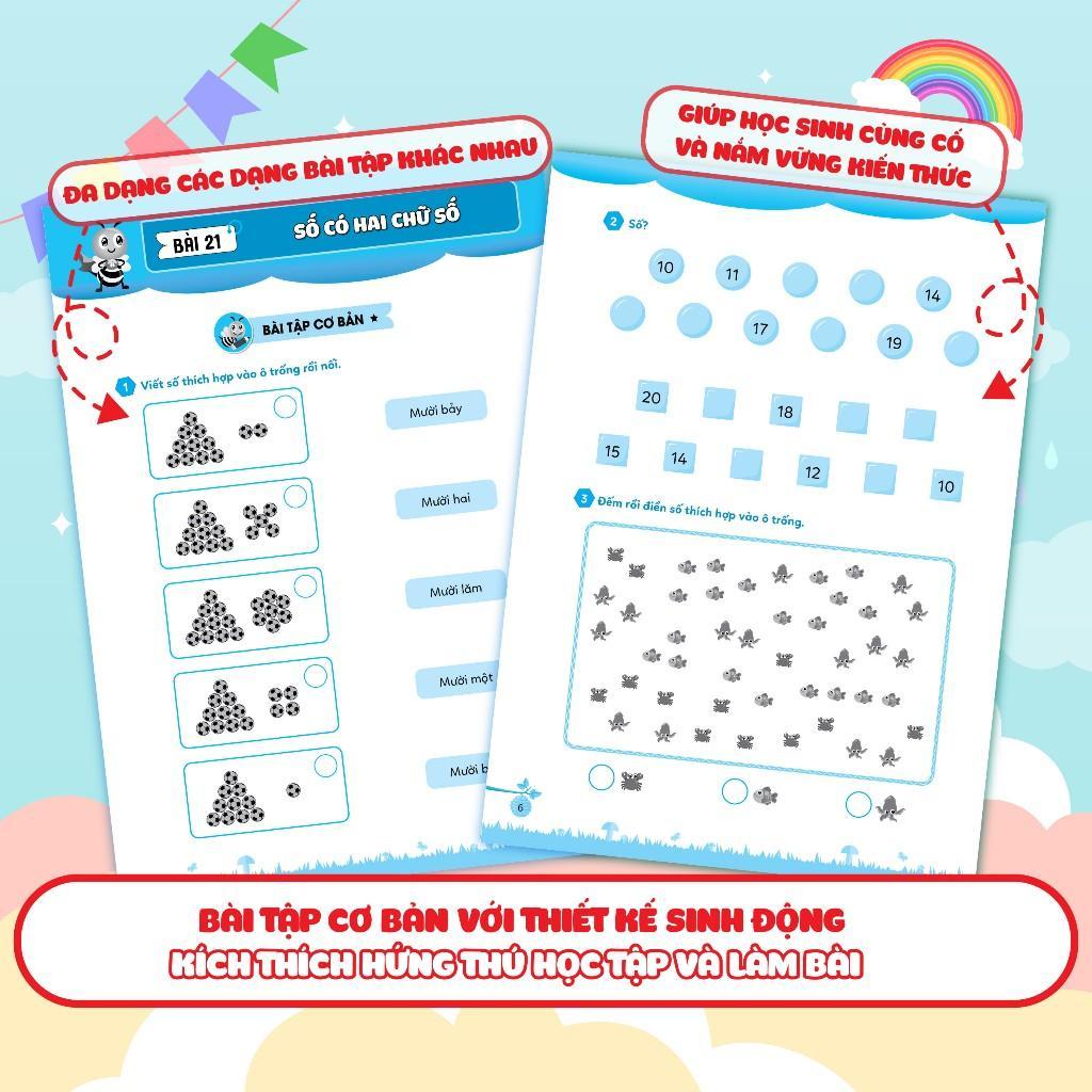 Các bài tập trong phần này được thiết kế sinh động, đầy cảm hứng với rất nhiều các hoạt động nối, tô màu, điền số,... giúp khơi gợi hứng thú học và làm bài tập của các em, đồng thời giúp các em củng cố và nắm chắc các kiến thức đã học.