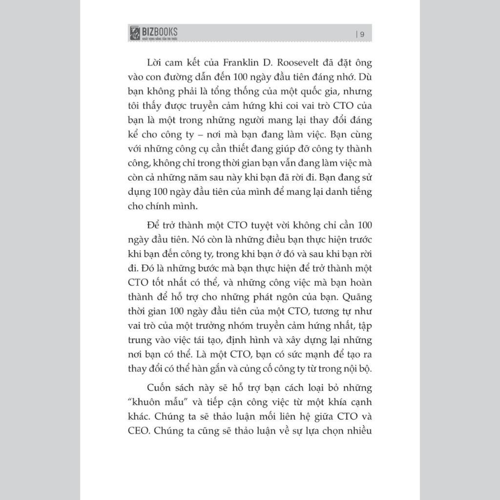 Cuốn sách được chia làm ba phần. Phần đầu tiên, bạn sẽ được hướng dẫn làm gì để chuẩn bị cho những cơ hội trở thành CTO tuyệt vời. Phần thứ hai, tác giả sẽ chỉ bạn trong 100 ngày làm thế nào để trở nên xuất sắc trong vai trò CTO. Và cuối cùng, một số thách thức mà bạn có thể phải đối mặt hằng ngày và cung cấp một số công cụ để giúp bạn vượt qua những thách thức đó.