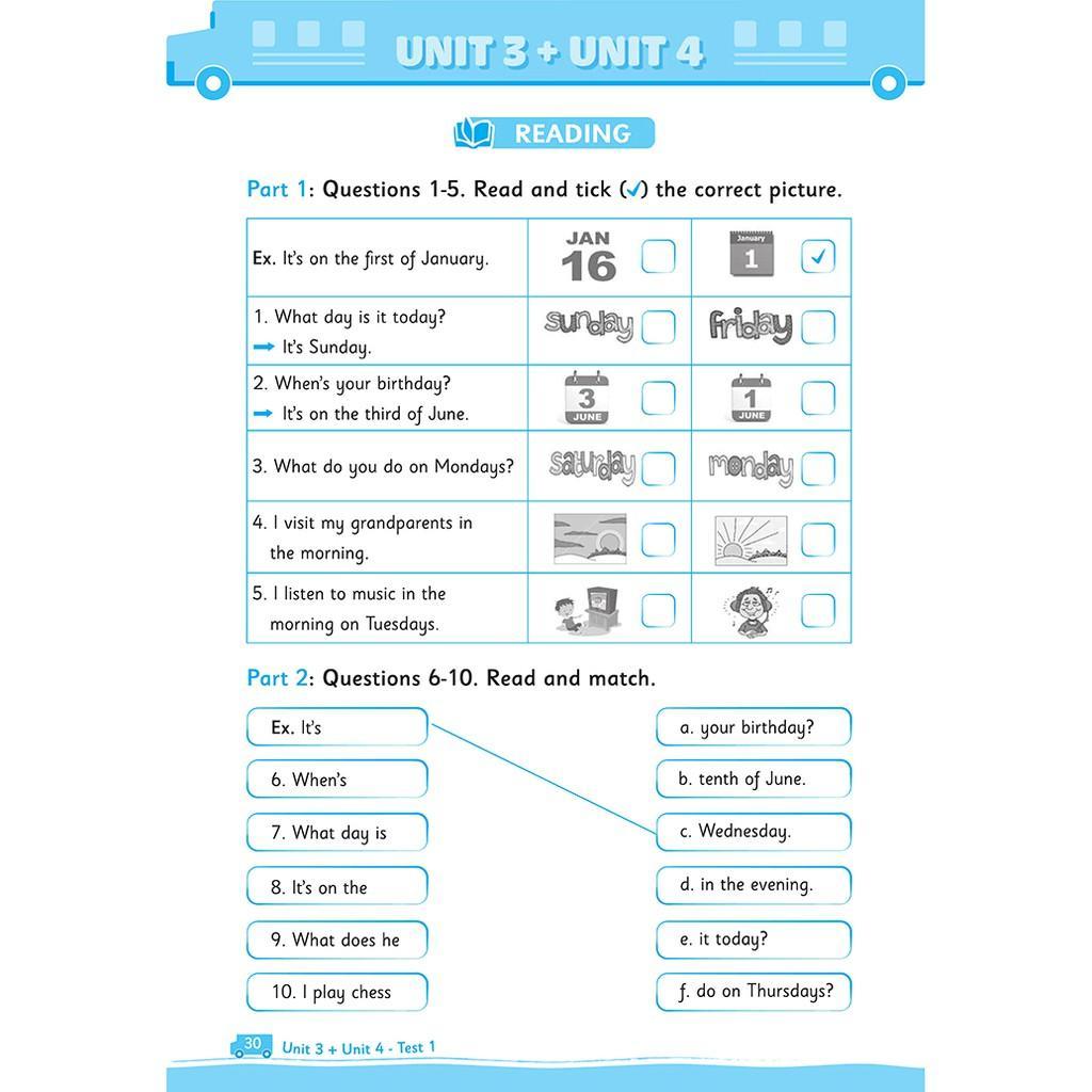 Cứ hai bài sẽ có 2 bài kiểm tra, tất cả các bài kiểm tra đều được thiết kế theo quy định thông tư mới nhất về kiểm tra môn Tiếng Anh tiểu học.