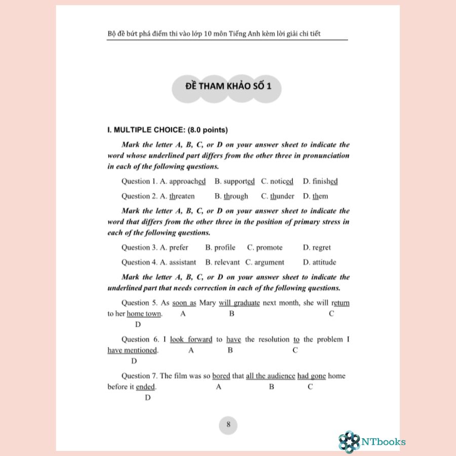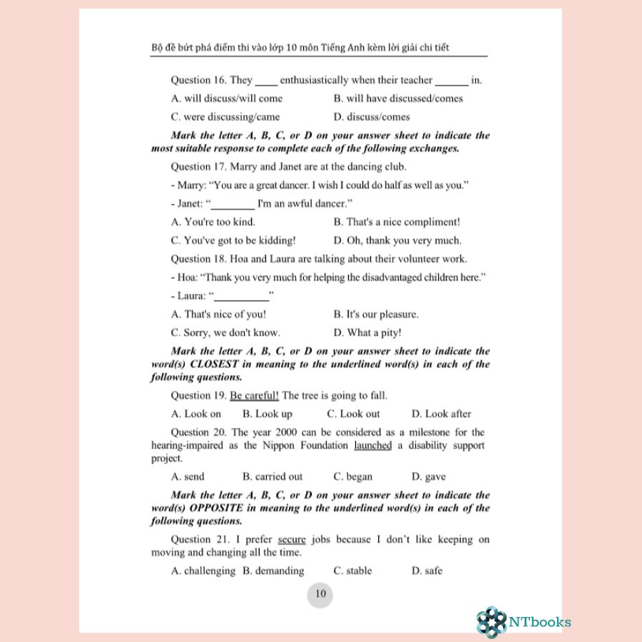 Cuốn sách “Bộ đề bứt phá điểm thi vào 10 môn Tiếng Anh kèm lời giải chi tiết” hướng đến là các em học sinh lớp 9, những người chuẩn bị vượt vũ môn để vào được ngôi trường trung học phổ thông mơ ước của mình. Ngoài ra, cuốn sách còn là nguồn ôn tập, tham khảo tin cậy dành cho giáo viên, quý phụ huynh và các em học sinh các khối lớp khác.