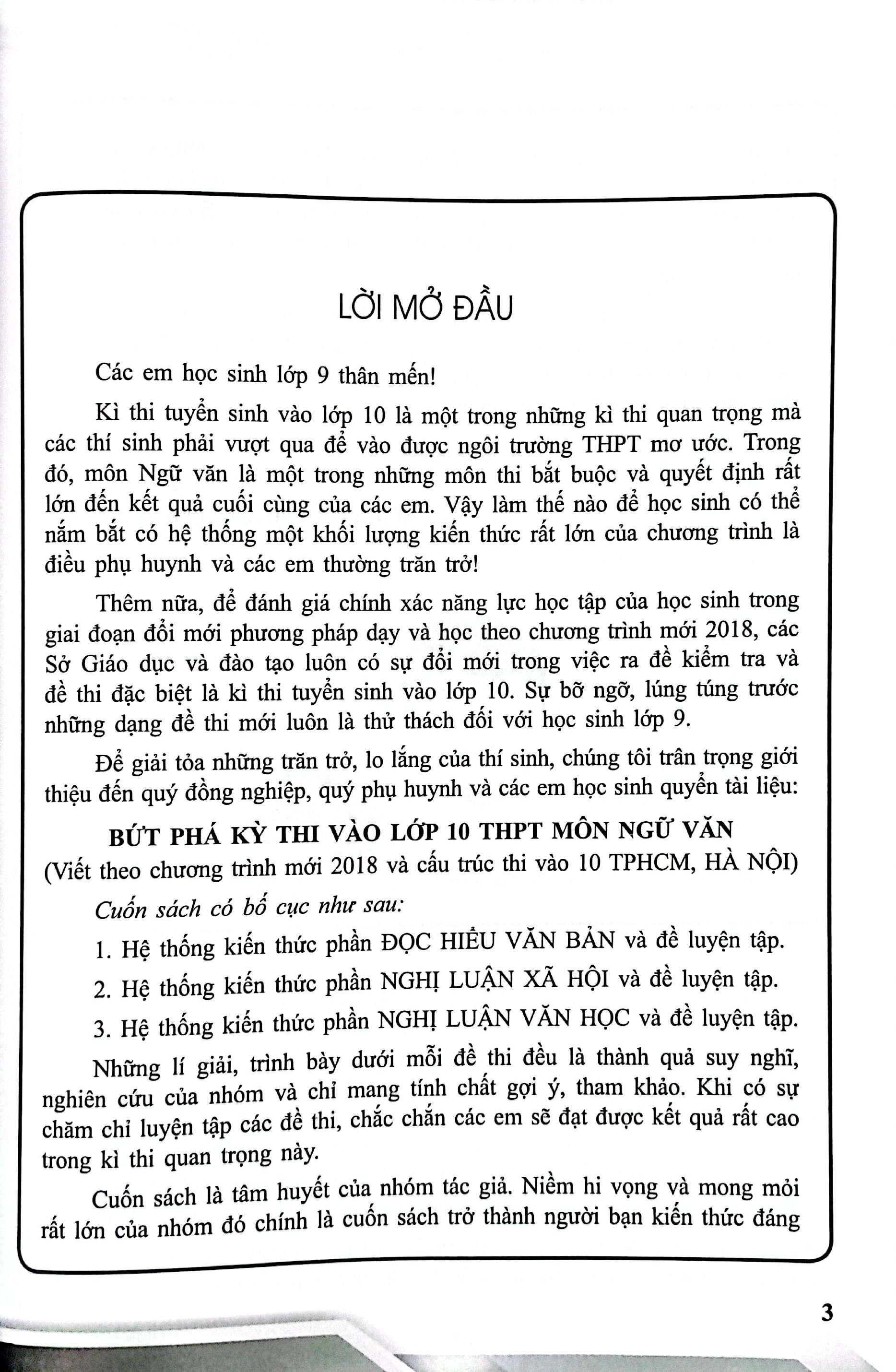 Để giải tỏa những trăn trở, lo lắng của thí sinh, chúng tôi trân trọng giới thiệu đến quý đồng nghiệp, quý phụ huynh và các em học sinh quyển tài liệu: BỨT PHÁ KỲ THI VÀO LỚP 10 THPT MÔN NGỮ VĂN (Viết theo chương trình mới 2018 và cấu trúc thi vào 10 TPHCM, HÀ NỘI) Cuốn sách có bố cục như sau:
