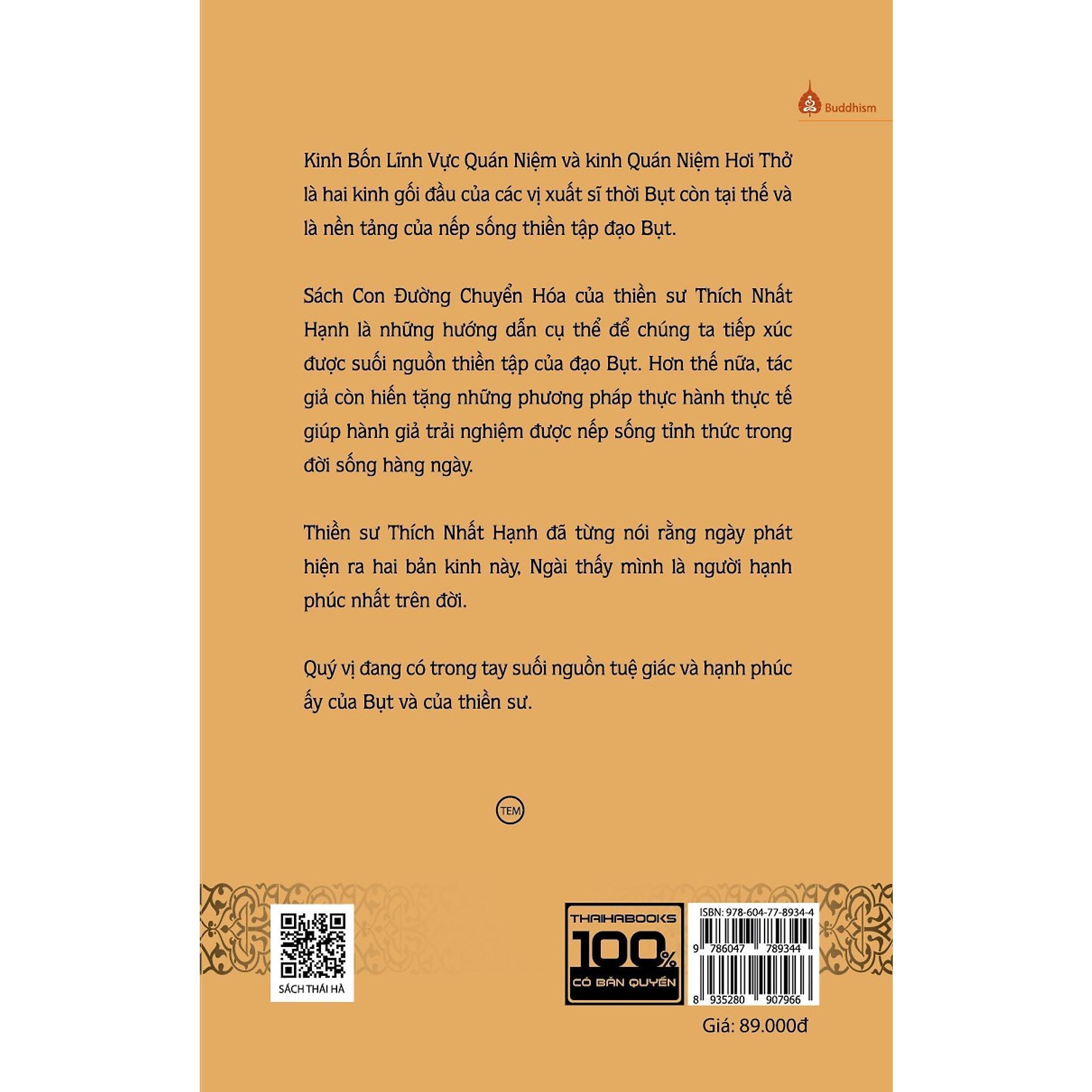 Kinh Bốn Lĩnh Vực Quán Niệm và kinh Quán Niệm Hơi Thở là hai kinh gối đầu giường của các vị khất sĩ thời Bụt còn tại thế và là nền tảng của nếp sống thiền tập đạo Bụt. Sách Con Đường Chuyển Hóa của thiền sư Thích Nhất Hạnh là những hướng dẫn cụ thể để chúng ta tiếp xúc được suối nguồn thiền tập của đạo Bụt. Hơn thế nữa, tác giả còn hiến tặng những phương pháp thực hành thực tế giúp hành giả trải nghiệm được nếp sống tỉnh thức trong đời sống hàng ngày. Thiền sư Thích Nhất Hạnh đã từng nói rằng ngày phát hiện ra hai bản kinh này, Ngài thấy mình là người hạnh phúc nhất trên đời. Mục lục: