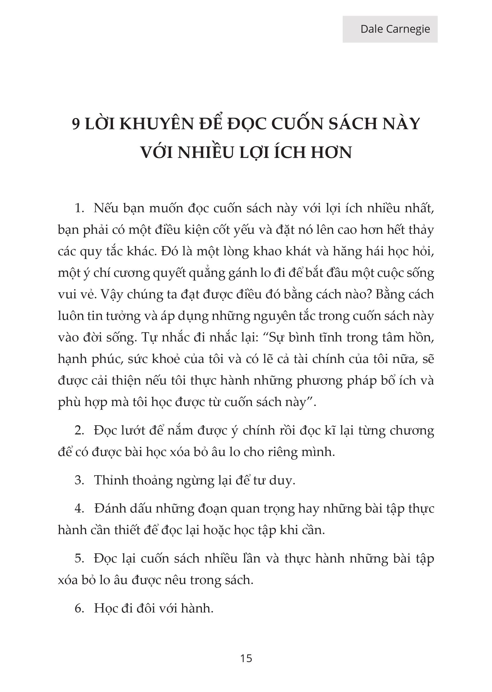 - QUẲNG GÁNH LO ĐI VÀ VUI SỐNG Cuốn sách bao gồm 10 phần khác nhau, với rất nhiều những kinh nghiệm và các lời khuyên từ tác giả cũng như những người đi trước, giúp bạn có thể nhận thức được những điều đúng đắn nhất. Chi tiết Phần 1. Những sự thật bạn cần biết về lo âu Phần 2. Những kĩ thuật cơ bản để phân tích tình trạng lo âu Phần 3. Cách để giũ ỏ âu lo trước khi nó phá huỷ con người Phần 4. 7 cách vun đắp mảnh đất tinh thần để bạn trở nên vui vẻ và hạnh phúc hơn mỗi ngày Phần 5. Nguyên tắc vàng để xoá bỏ lo âu Phần 6. Cách chống lại lo âu khi bị chỉ trích Phần 7. Mệt mỏi dần tan biến - Tinh thần lên đỉnh cao Phần 8. Tìm việc đúng ý gặt hái thành công Phần 9. Cách giảm bớt nỗ lo tài chính