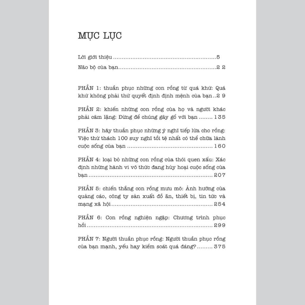 • Phần 7: Người thuần thục rồng: Người thuần thục rồng của bạn mạnh, yếu hay kiểm soát quá đáng? Cuốn sách đã phân tích tất cả những lí do, cả rõ ràng lẫn tiềm ẩn mà những con rồng và ý nghĩ tiêu cực không ngừng thì thầm trong não bộ của bạn, làm bạn cảm thấy buồn bực, lo âu, u uất, tức giận hay mất kiểm soát. Với những phương pháp nhằm chinh phục các con rồng, bạn sẽ lấy lại quyền kiểm soát não bộ của mình và lựa chọn những gì mình muốn nghe. Bạn sẽ không phải đương đầu trước những suy nghĩ tiêu cực hay để thói quen xấu hủy hoại sức khỏe cùng các mối quan hệ của mình khi trải qua căng thẳng cực độ, sang chấn hay tiếc thương. Bạn sẽ nhận ra đâu là sự thật, xây dựng được sự tự tin, đưa tâm trí mình vào khuôn khổ, cảm thấy hạnh phúc hơn, bình thản hơn và nắm trong tay vận mệnh cùa mình. Để giúp bạn hình thành những hành vi tích cực Cuốn sách viết và đưa bạn vào những phương pháp thực hành và bài tập để bạn rèn luyện và phát triển khả năng tư duy, tạo ra thói quen hành vi tốt cho bản thân. Những phương pháp đó mang lại cho người đọc một hiểu biết sâu hơn về cách não bộ hoạt động và xử lý thông tin. Đồng thời, bạn cũng sẽ được học cách kiểm soát tư duy và cảm xúc, và cách khám phá sự sáng tạo trong không gian tư duy. Được viết với phong cách hấp dẫn "Đánh Thức Não Bộ" sẽ là cẩm nang là một hành trình khám phá sự kỳ diệu của bộ não và cách tận dụng tối đa tiềm năng của chính mình. Bizbooks thân mời độc giả đón đọc, bạn sẽ có những phần thưởng đáng kinh ngạc trong việc phát triển tư duy, sáng tạo thành công trong cuộc sống. Thông tin chi tiết cuốn Sách - Đánh Thức Não Bộ: Kích Hoạt Năng Lực Tiềm Ẩn Của Não Bộ Để Loại Bỏ Suy Nghĩ Và Hành Vi Tiêu Cực - MCBooks