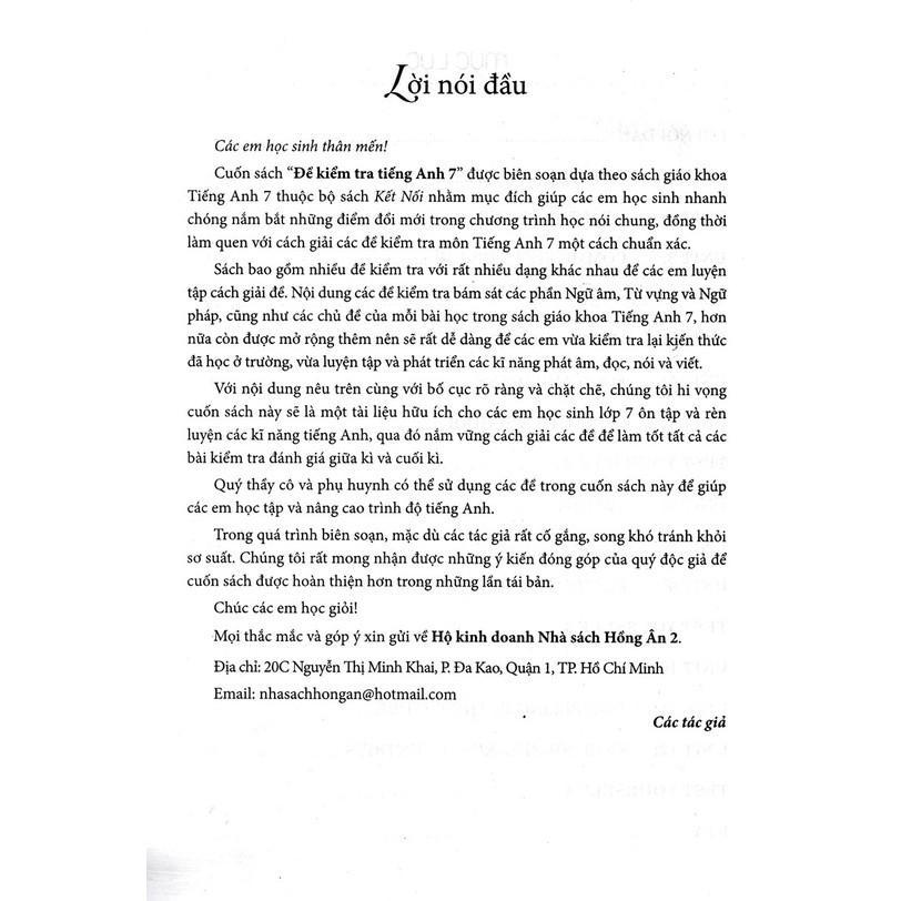 Cuốn sách Đề Kiểm Tra Tiếng Anh 7 (Dùng Kèm SGK Kết Nối) được biên soạn dựa theo sách giáo khoa Tiếng Anh 7 thuộc bộ sách Kết Nối nhằm mục đích giúp các em học sinh nhanh chóng nắm bắt những điểm đổi mới trong chương trình học nói chung, đồng thời làm quen với cách giải các đề kiểm tra môn Tiếng Anh 7 một cách chuẩn xác.