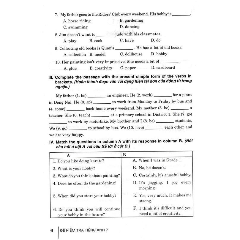 Sách bao gồm nhiều để kiểm tra với rất nhiều dạng khác nhau để các em luyện tập cách giải đề. Nội dung các đề kiểm tra bám sát các phần Ngữ âm, Từ vựng và Ngữ pháp, cũng như các chủ đề của mỗi bài học trong sách giáo khoa Tiếng Anh 7, hơn nữa còn được mở rộng thêm nên sẽ rất dễ dàng để các em vừa kiểm tra lại kiến thức đã học ở trường, vừa luyện tập và phát triển các kĩ năng phát âm, đọc, nói và viết.
