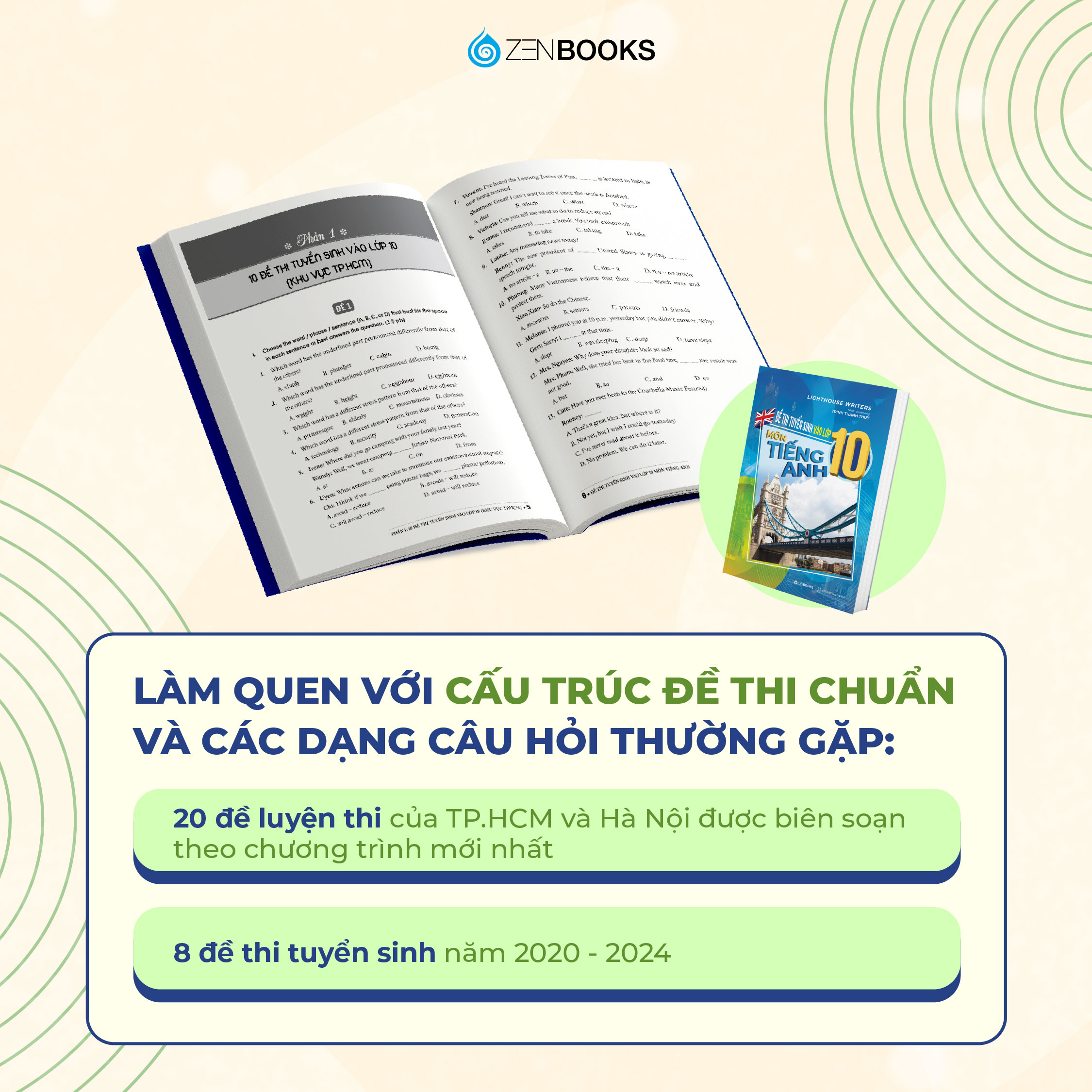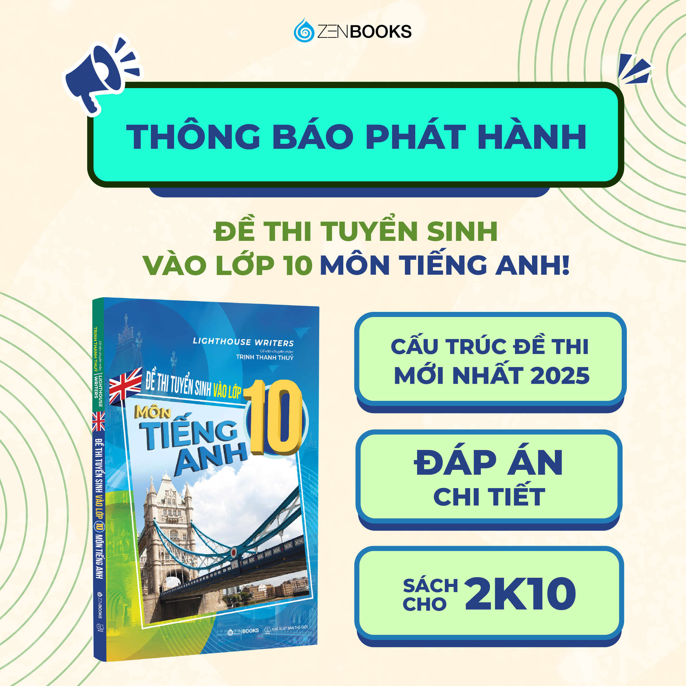 Đề Thi Tuyển Sinh Vào Lớp 10 Môn Tiếng Anh (Có Đáp Án) Tác giả: Trịnh Thanh Thủy Công ty phát hành: Zenbooks Nhà xuất bản: Thế giới Năm xuất bản: 2025 Giới thiệu về sách Đề Thi Tuyển Sinh Vào Lớp 10 Môn Tiếng Anh Đề Thi Tuyển Sinh Vào Lớp 10 Môn Tiếng Anh (Có Đáp Án) là tài liệu ôn luyện lý tưởng cho học sinh lớp 9 trong giai đoạn nước rút trước kỳ thi vào lớp 10. Cuốn sách tổng hợp các đề thi bám sát cấu trúc chính thức, giúp học sinh làm quen với dạng đề, nâng cao kỹ năng và tự tin bước vào kỳ thi quan trọng này. Nội dung nổi bật của sách