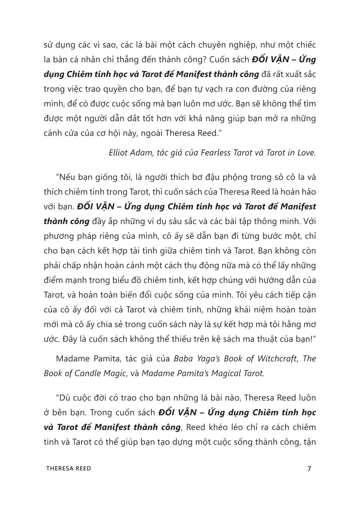Trong ĐỔI VẬN – Ứng dụng Chiêm tinh học và Tarot để Manifest thành công, “Quý bà Tarot” Theresa Reed sẽ hướng dẫn bạn cách xây dựng con đường thành công bằng cách sử dụng chiêm tinh và Tarot để khai phá, đánh thức những tiềm năng độc đáo của bản thân và những thử thách bạn sẽ gặp trong hành trình cuộc đời. Cuốn sách này sẽ giúp bạn:
