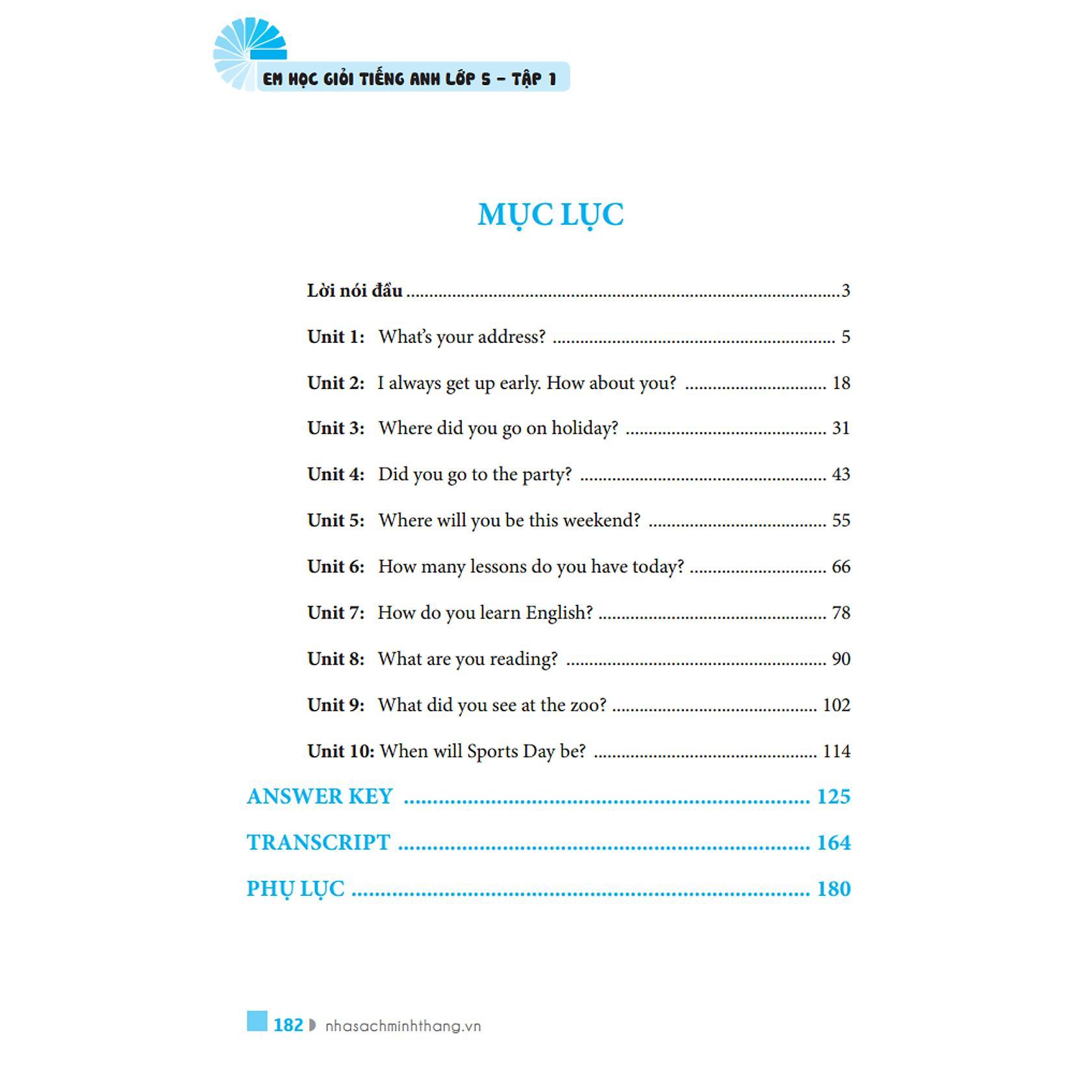 Bộ sách “Em học giỏi tiếng Anh lớp 5 tập 1 và tập 2” được biên soạn theo khung giáo trình tiếng Anh đang được giảng dạy trong các trường tiểu học trên toàn quốc.Bộ sách được biên soạn rất công phu, kỹ lưỡng và là tâm huyết của các giáo viên, giảng viên có nhiều kinh nghiệm giảng dạy ở các trường chuyên Anh.Bộ sách được chia thành 2 tập: Tập 1: từ Unit 1 đến Unit 10 Tập 2: từ Unit 11 đến Unit 20Với mỗi bài học, chúng tôi đều biên soạn theo ba phần kiến thức cơ bản: Lý thuyết, Thực hành ngôn ngữ và Thực hành kỹ năng. Phần Lý thuyết tổng hợp nội dung ngữ pháp quan trọng của từng bài học. Phần Thực hành ngôn ngữ được trình bày một cách chi tiết, khoa học theo ba phần: Từ vựng - Ngữ âm - Ngữ pháp giúp các em vận dụng các kiến thức trong phần Lý thuyết. Phần Thực hành kỹ năng: Các bài tập được biên soạn theo từng bài học có nội dung tương ứng với bài học trong sách giáo khoa giúp các học sinh thực hành kỹ năng Nghe - Nói - Đọc - Viết.
