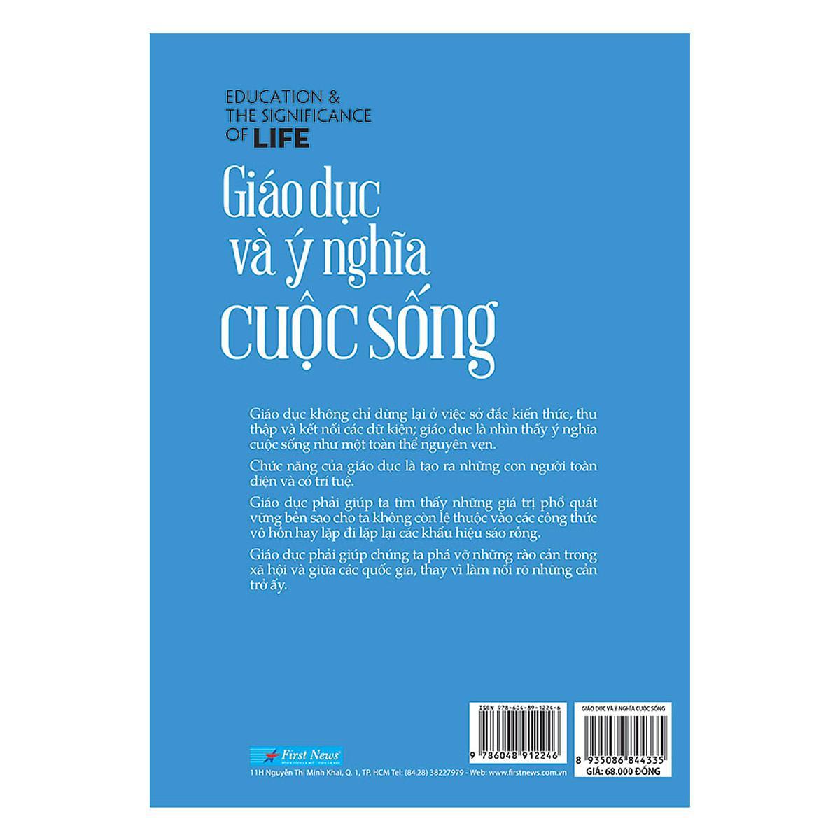Càng đi sâu vào tác phẩm, càng nhận ra, Giáo Dục Và Ý Nghĩa Cuộc Sống mang đến câu chuyện hoàn toàn mới về giáo dục. Theo đó, con người là một tổng thể hài hòa được tạo thành từ nhiều khía cạnh khác nhau. Nền giáo dục phải mang đến sự hợp nhất các khía cạnh riêng biệt này – vì nếu không có sự hợp nhất ấy, cuộc sống sẽ trở thành một chuỗi những cuộc xung đột và nỗi bất hạnh. Muốn tạo dựng một nền giáo dục đúng đắn, ta phải hiểu rõ ý nghĩa cuộc sống trong tính toàn thể của nó.