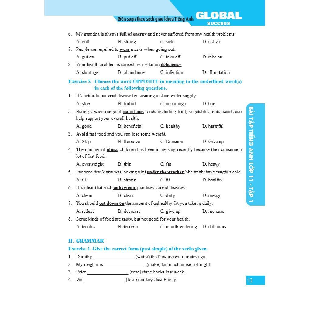 Chương trình Tiếng Anh lớp 11, chúng tôi đã biên soạn cuốn sách “BÀI TẬP TIẾNG ANH LỚP 11". Các dạng bài tập phong phú, đa dạng, bám sát ngữ pháp và từ vựng theo chủ đề từng đơn vị bài tập. Mỗi đơn vị bài tập gồm 4 phần: