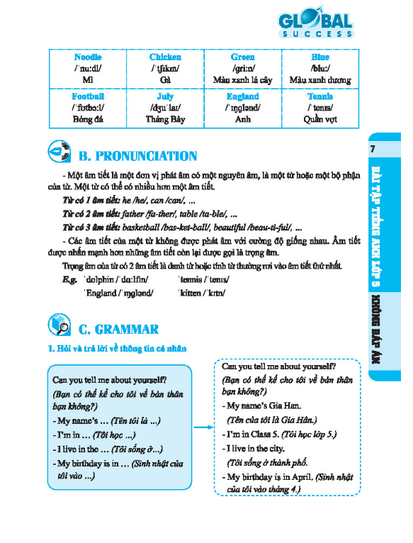 --------------Giới thiệu sách--------------- "BÀI TẬP TIẾNG ANH LỚP 5” với các dạng bài tập phong phú, da dang, bám sát ngữ pháp và từ vựng theo chủ đề từng đơn vị bài tập. Mỗi đơn vị bài tập gồm 4 phần: PART A: VOCABULARY (Từ vựng theo từng Unit) PART B: PRONUNCIATION (Lý thuyết phát âm) PART C: GRAMMAR (Lý thuyết ngữ pháp trọng tâm) PART D: PRACTICE (Cùng cố phát âm, từ vựng, ngữ pháp, kỹ năng đọc và kỹ năng viết) Bên cạnh đó, hệ thống bài kiểm tra (REVIEW) đa dang theo hình thức trắc nghiệm và tự luận, bám sát các nội dung, dạng bài trong đề thi thật giúp các em ôn tập và rèn luyên trước các kỳ thi, bài kiểm tra 15 phút, 45 phút, và cuối kỳ