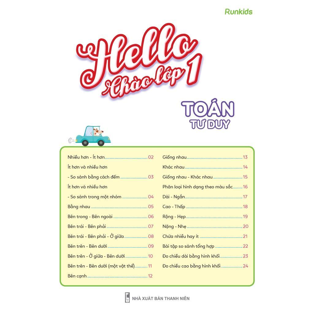 - Hello Chào lớp 1 – Làm quen tiếng Anh ƯU ĐIỂM CỦA BỘ SÁCH HELLO CHÀO LỚP 1 Trang bị đầy đủ và toàn diện kiến thức cho con tự tin vào lớp 1: tiếng Việt, Toán và tiếng Anh Bộ sách được xây dựng dựa trên chương trình đào tạo mới nhất của Bộ GD&ĐT, giúp con tạo dựng nền tảng kiến thức vững vàng Phương pháp học bằng hình ảnh, tạo hứng thú, khơi dậy đam mê, kích thích trí tưởng tượng và phát triển tư duy đa chiều cho con ngay từ khi bắt đầu Hệ thống bài tập thực hành đa dạng, con được “học đi đôi với hành”, từ đó con hiểu sâu, nhớ lâu kiến thức bài học Quà tặng Sticker thú vị được thiết kế riêng cho từng cuốn, giúp con thêm hứng thú và động lực học tập Với những ưu điểm trên, Hello Chào lớp 1 sẽ là người bạn đồng hành với hành trang toàn diện nhất, giúp con tự tin bước vào lớp 1! Công ty phát hành MEGABOOK Nhà xuất bản Thanh Niên Trọng lượng 500 gram Kích Thước 19 x 27 cm Tác giả Runkids Ngày xuất bản 2021 Số trang 24