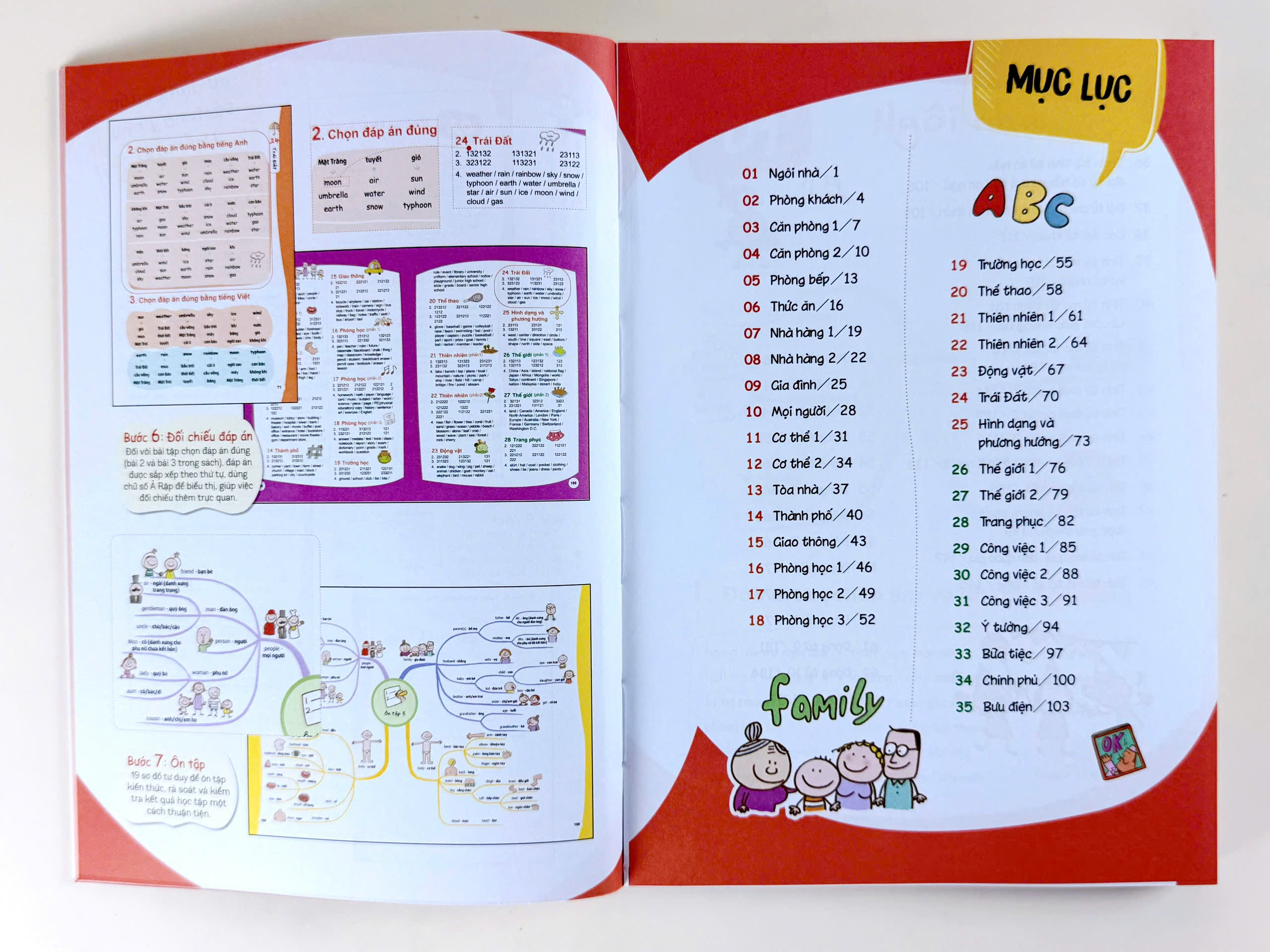 - Hình thức: Bìa mềm Bao gồm 62 chủ đề đa dạng, từ vựng phong phú Phân chia từ vựng theo 62 chủ đề phổ biến trong cuộc sống và giao tiếp hằng ngày như: Home (Ngôi nhà), School (Trường học), Travel (Du lịch), Health (Sức khỏe), Shopping (Mua sắm)… Giúp học nhanh hơn, nhớ lâu hơn nhờ cách trình bày khoa học theo sơ đồ tư duy. Phát âm chuẩn ngay từ đầu với phần phiên âm rõ ràng. Nâng cao khả năng phản xạ từ vựng thông qua hệ thống bài tập thực hành đa dạng.