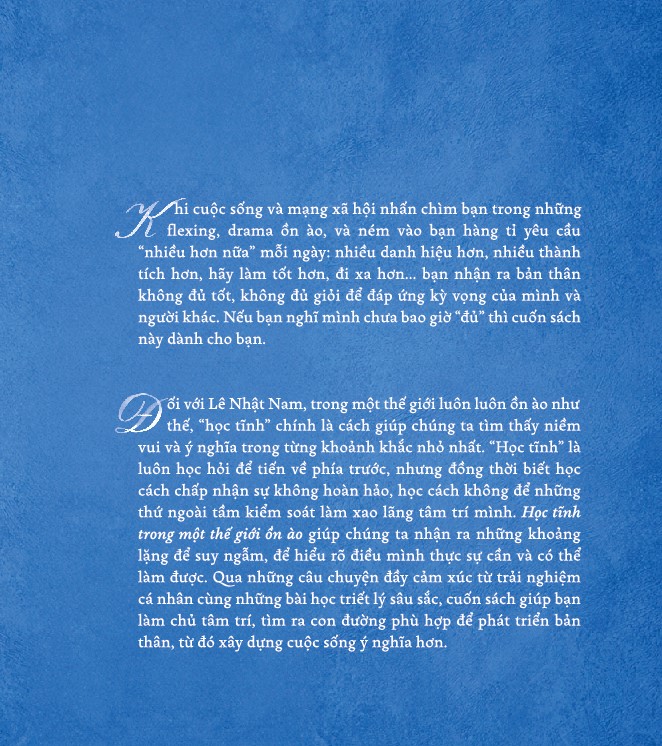 Đối với Lê Nhật Nam, trong một thế giới luôn luôn ồn ào như thể, “học tĩnh” chính là cách giúp chúng ta tìm thấy niềm vui và ý nghĩa trong từng khoảnh khắc nhỏ nhất. “Học tĩnh” là luôn học hỏi để tiến về phía trước, nhưng đồng thời biết học cách chấp nhận sự không hoàn hảo, học cách không để những thứ ngoài tầm kiểm soát làm xao lãng tâm trí mình. Học tĩnh trong một thế giới ổn ào giúp chúng ta nhận ra những khoảng lặng để suy ngẫm, để hiểu rõ điều mình thực sự cần và có thể làm được. Qua những câu chuyện đầy cảm xúc từ trải nghiệm cá nhân cùng những bài học triết lý sâu sắc, cuốn sách giúp bạn làm chủ tâm trí, tìm ra con đường phù hợp để phát triển bản thân, từ đó xây dựng cuộc sống ý nghĩa hơn.
