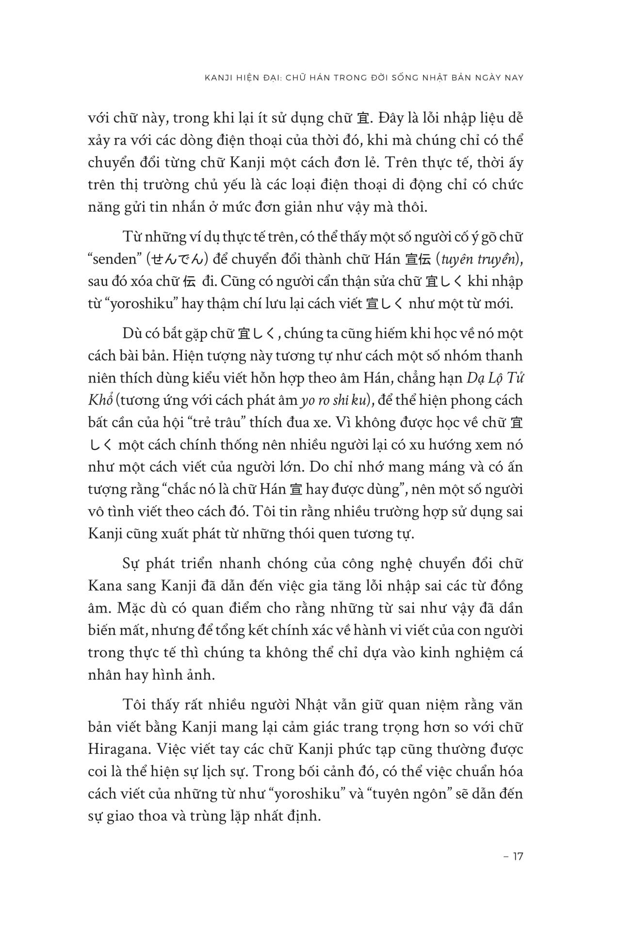 Bên cạnh đó, cuốn sách cũng đề cập đến ảnh hưởng của chữ Hán trong các lĩnh vực như thực phẩm, tiền tệ và giáo dục, cũng như mối liên hệ với các quốc gia sử dụng chữ Hán khác như Trung Quốc và Việt Nam. Với cách tiếp cận toàn diện và sâu sắc, Kanji hiện đại là một tài liệu quý giá cho những ai quan tâm đến ngôn ngữ và văn hóa Nhật Bản.