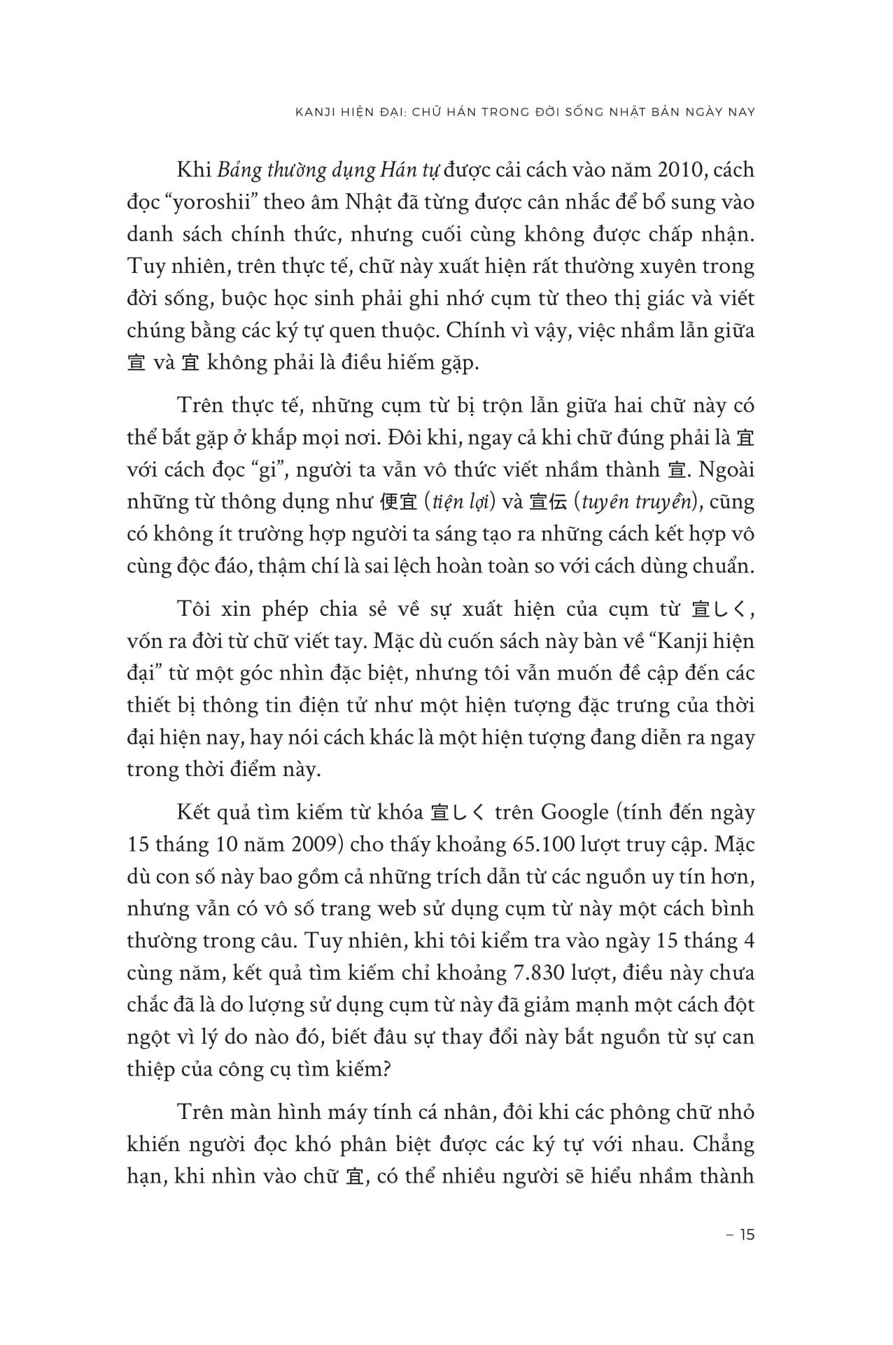 Cuốn sách này được tổng hợp dựa trên loạt bài viết có tiêu đề “Kanji ngày nay'' được đăng trên trang chủ của nhà xuất bản Sanseido. Khi soạn thành sách, tôi đã bổ sung thêm khá nhiều nội dung. Ngoài việc thêm nhiều đoạn, tôi cũng thay thế một số hình ảnh minh họa. Những sự kiện đến rồi đi, dường như mờ nhạt giữa dòng chảy thường nhật, nay được tôi ghi chép lại một cách khách quan. Nhờ việc duy trì thói quen viết lách đều đặn, tôi có cơ hội xâu chuỗi suy nghĩ và tổng hợp những ý tưởng của m.ình. Theo thời gian, việc ghi chép ấy dần trở thành một thói quen, giúp tôi ngày càng ý thức rõ hơn về mục đích của bản thân. Kể cả khi đi chơi, tôi vẫn tự hỏi liệu khả năng cảm thụ của m.ình đã tiến xa đến đâu. Trong cuốn sách này, tôi đã bộc bạch tất cả — những khó khăn, niềm vui, cũng như phương pháp nghiên cứu và suy ngẫm của m.ình.Có lần, có người hỏi tôi rằng: Làm sao anh có thể vừa nghiên cứu một cách tỉ mỉ, vừa viết lách trôi chảy đến vậy? Dù mỗi công việc có quy trình khác nhau, nhưng chúng không chỉ đơn thuần là những giờ miệt mài trên bàn làm việc. Nghiên cứu không nên là một trò chơi điên cuồng, cũng không nên là một cuộc thí nghiệm đầy khổ sở. Một phần của quá trình ấy—cả những gì đã thành hình lẫn những gì còn dang dở — sẽ xuất hiện đâu đó trong cuốn sách này.