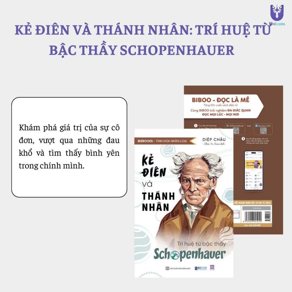 Sách - Kẻ điên và thánh nhân: Trí huệ từ bậc thầy Schopenhauer - Tinh hoa nhân loại - Bizbooks là cánh cửa đưa bạn bước vào thế giới tư tưởng của Arthur Schopenhauer – một trong những triết gia vĩ đại nhất của phương Tây, người đã đặt nền móng cho triết học hiện đại bằng chủ nghĩa ý chí và cái nhìn bi quan sâu sắc về cuộc đời.