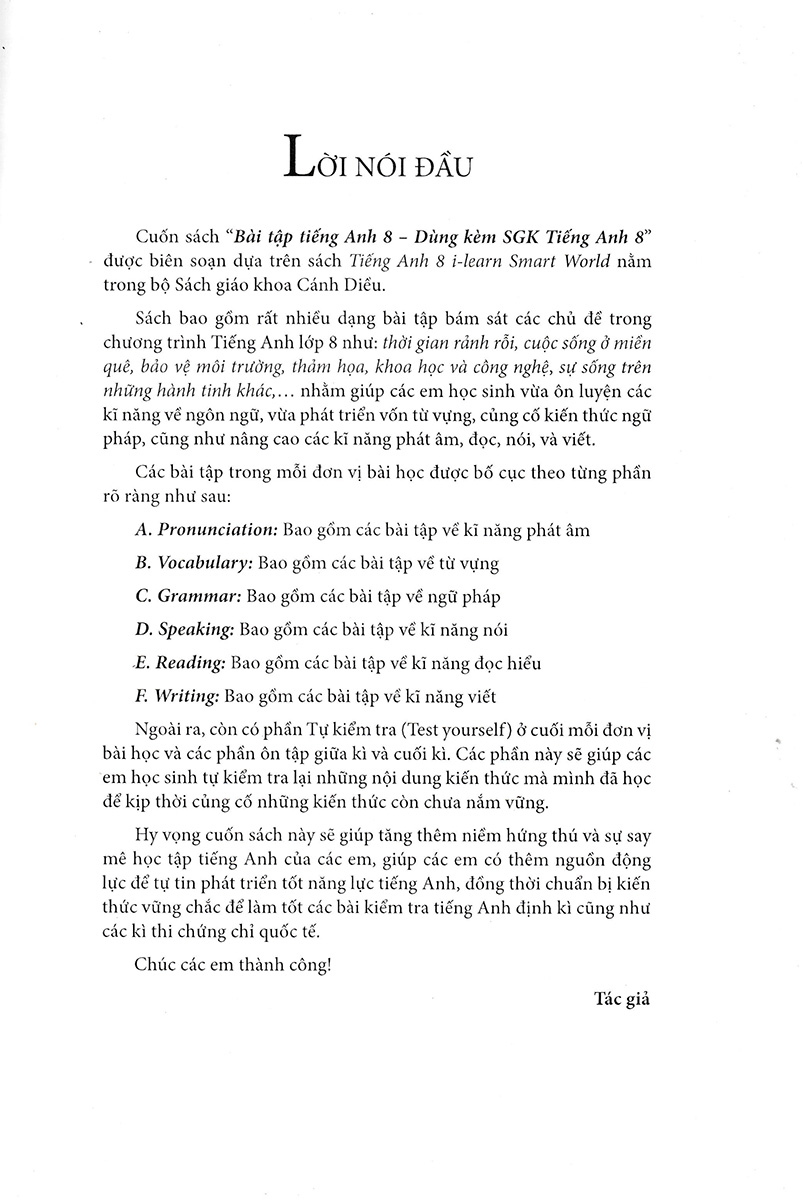 Hy vọng cuốn sách này sẽ giúp tăng thêm niềm hứng thú và sự say mê học tập tiếng Anh của các em, giúp các em có thêm nguồn động lực để tự tin phát triển tốt năng lực tiếng Anh, đồng thời chuẩn bị kiến thức vững chắc để làm tốt các bài kiểm tra tiếng Anh định kì cũng như các kì thi chứng chỉ quốc tế.