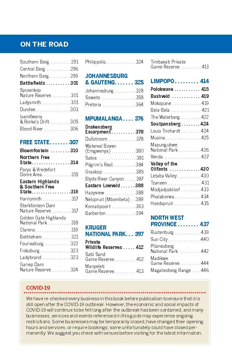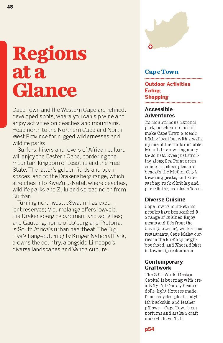 ---------------------------------------- Lonely Planet's South Africa, Lesotho & Eswatini is your passport to the most up-to-date advice on what to see and skip, and what hidden discoveries await you. Lounge on a Cape Town beach, spot wildlife in Kruger National Park; all with your trusted travel companion. Get to the heart of South Africa, Lesotho & Eswatini and begin your journey now! Inside Lonely Planet's South Africa, Lesotho & Eswatini Travel Guide: Up-to-date information - all businesses were rechecked before publication to they are still open after 2020's COVID-19 outbreak NEW top experiences feature - a visually inspiring collection of South Africa's best experiences and where to have them What's NEW feature taps into cultural trends and helps you find fresh ideas and cool new areas NEW pull-out, passport-size 'Just Landed' card with wi-fi, ATM and transport info - all you need for a smooth journey from airport to hotel Improved planning tools for family travellers - where to go, how to save money, plus fun stuff just for kids Colour maps and images throughout Highlights and itineraries help you tailor your trip to your personal needs and interests Insider tips to save time and money and get around like a local, avoiding crowds and trouble spots Essential info at your fingertips - hours of operation, websites, transit tips, prices Honest reviews for all budgets - eating, sleeping, sightseeing, going out, shopping, hidden gems that most guidebooks miss Cultural insights give you a richer, more rewarding travel experience - history, people, music, landscapes, wildlife, cuisine, politics Over 102 maps Covers Cape Town, Western Cape, Eastern Cape, KwaZulu-Natal, Free State, Johannesburg & Gauteng, Mpumalanga, Kruger National Park, Limpopo, North West Province, Northern Cape, Lesotho, Eswatini The Perfect Choice: Lonely Planet's South Africa, Lesotho & Eswatini, our most comprehensive guide to South Africa, Lesotho & Eswatini, is perfect for both exploring top sights and taking roads less travelled. Looking for more extensive coverage? Check out Lonely Planet's Cape Town & the Garden Route for a comprehensive look at all the region has to offer. About Lonely Planet: Lonely Planet is a leading travel media company, providing both inspiring and trustworthy information for every kind of traveller since 1973. Over the past four decades, we've printed over 145 million guidebooks and phrasebooks for 120 languages, and grown a dedicated, passionate global community of travellers. You'll also find our content online, and in mobile apps, videos, 14 languages, armchair and lifestyle books, ebooks, and more, enabling you to explore every day. 'Lonely Planet guides are, quite simply, like no other.' - New York Times 'Lonely Planet. It's on everyone's bookshelves; it's in every traveller's hands. It's on mobile phones. It's on the Internet. It's everywhere, and it's telling entire generations of people how to travel the world.' - Fairfax Media (Australia)