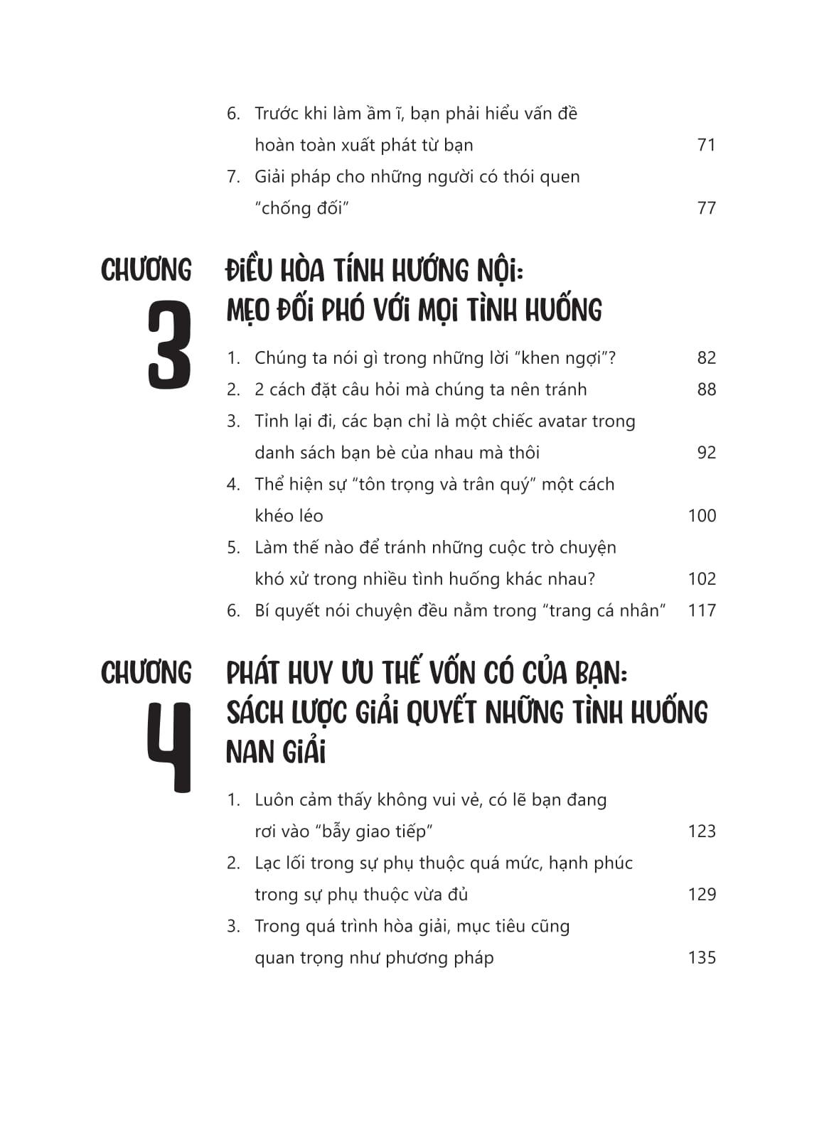 Lớp Học Giao Tiếp Cho Người Hướng Nội - Vượt Qua Định Kiến Bản Thân Để Tự Tin Thuyết Phục Đám Đông Ai cũng cho rằng, nhiều cơ hội “béo bở” chỉ rơi vào tay của những kẻ hướng ngoại khéo ăn khéo nói. Vậy nếu là người hướng nội, kiệm lời và thích lắng nghe, thì chúng ta phải chấp nhận vài sự lựa chọn kém hấp dẫn sao? Tin tốt là: Lớp học giao tiếp cho người hướng nội sẽ chứng minh cho bạn thấy điều ngược lại. Với các bài học mở khóa 1% tự tin của bản thân, nhảy qua “bẫy phụ thuộc” trong mọi cuộc trò chuyện, ghi điểm bằng lối “nói ít nhưng ấn tượng”... Bạn sẽ nắm được bí thuật giao tiếp để kết nối đám đông, thu hút lợi thế cho chính m.ình. Cuốn sách này là “cẩm nang” chi tiết giúp người hướng nội: