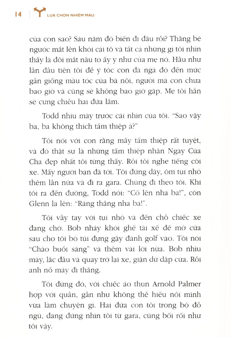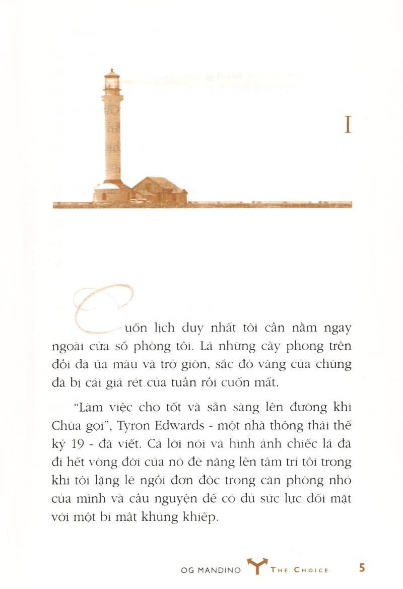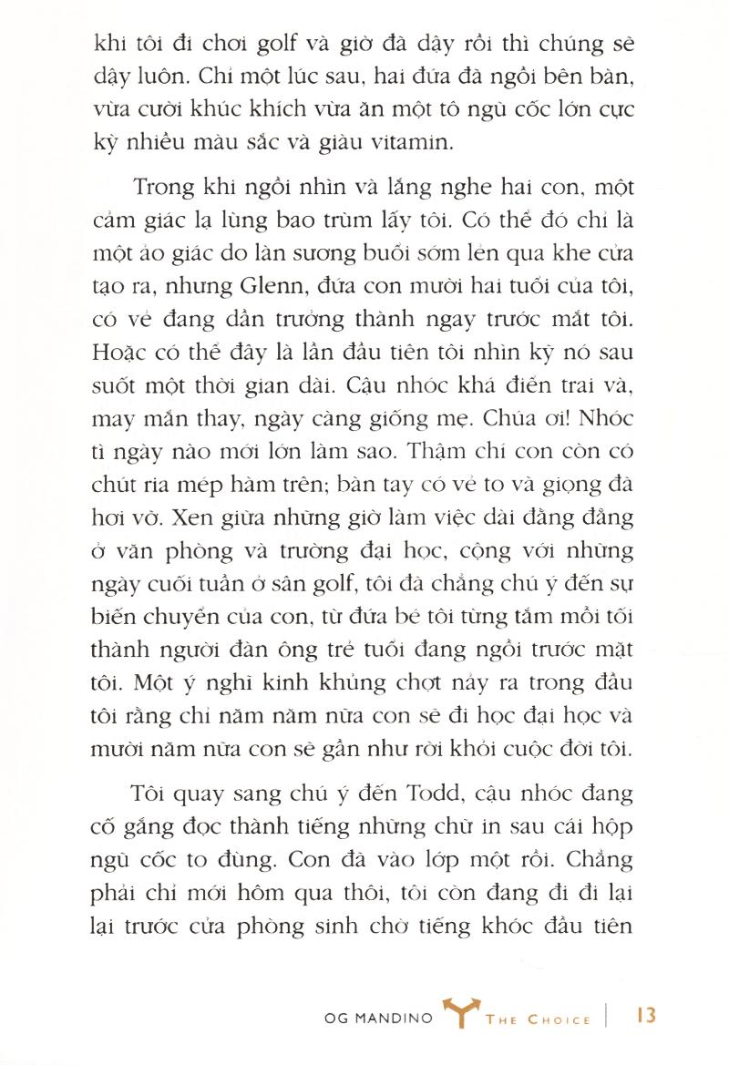 Cuốn sách được Og Mandino hóa thân mình bằng câu chuyện của Mark Christopher. Trải qua nhiều khó khăn trong quá khứ, khi Mark đang đứng ở ngưỡng cửa thành công nhất với công việc là một nhà đào tạo bán hàng giỏi nhất nhì trong nghành, thì đó cũng là lúc ông dành tất cả thời gian cho công việc, cho những cuộc hẹn, với những dự án, với những người bạn, với mỗi cuộc cụng ly, kề chén hay những chuyến đi chơi… mà quên đi người vợ hiền và hai con trai vẫn ngày ngày chờ cơm nơi ngôi nhà bé nhỏ. Bỗng một ngày, hai cậu con trai chạy đến và chúc mừng ngày của Cha. Có lẽ chẳng có món quà nào ý nghĩa hơn bằng những cử chỉ của con, nắn nót nhưng nguệch ngoạc của một đứa trẻ tập tẹ nối ghép từng chữ viết vào bưu thiếp “gửi người Ba tuyệt vời nhất trên đời” rồi rón rén bước đến đồng thanh: “Chúc Ba ngày của cha vui vẻ”. Lúc này, một người đàn ông kiên định, mạnh mẽ cũng chẳng thể giấu nổi cảm xúc chợt buột ra từ đôi mắt. Và ông chẳng thể nói với con rằng những giọt nước mắt của cha là do tất cả những giờ, những ngày, những năm mà ông đã dành cho các dự án, các cuộc họp bán hàng và các buổi đánh golf bất tận, cho đến khi hai đứa con bé bỏng của mình đã lớn và sắp rời bỏ mình. Và ông nhận ra, điều ý nghĩa hơn bao giờ hết mà ông phải lựa chọn không phải là ký được dự án lớn hay lên chức một ông chủ mà đó chính là làm được điều mình mơ ước trở thành nhà văn, và trả nợ cho gia đình nhỏ mà Mark đã vô tâm bấy lâu nay. Mỗi sự chọn lựa đều mang hơi thở của sự sống, và cả sự đối đãi của bạn với chính mình.
