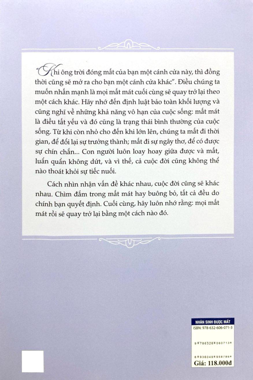 Khi ông trời đóng mất của bạn một cánh cửa này, thì đồng thời cũng sẽ mở ra cho bạn một cánh cửa khác". Điều chúng ta muốn nhấn mạnh là mọi mất mát cuối cùng sẽ quay trở lại theo một cách khác. Hãy nhớ đến định luật bảo toàn khối lượng và cũng nghĩ về những khả năng vô hạn của cuộc sống: mất mát là điều tất yếu và đó cũng là trạng thái bình thường của cuộc sống. Từ khi còn nhỏ cho đến khi lớn lên, chúng ta mất đi thời gian, để đổi lại sự trưởng thành; mất đi sự ngây thơ, để có được sự chín chắn... Con người luôn loay hoay giữa được và mất, luẩn quần không dứt, và vì thế, cả cuộc đời cũng không thể nào thoát khỏi sự tiếc nuối.