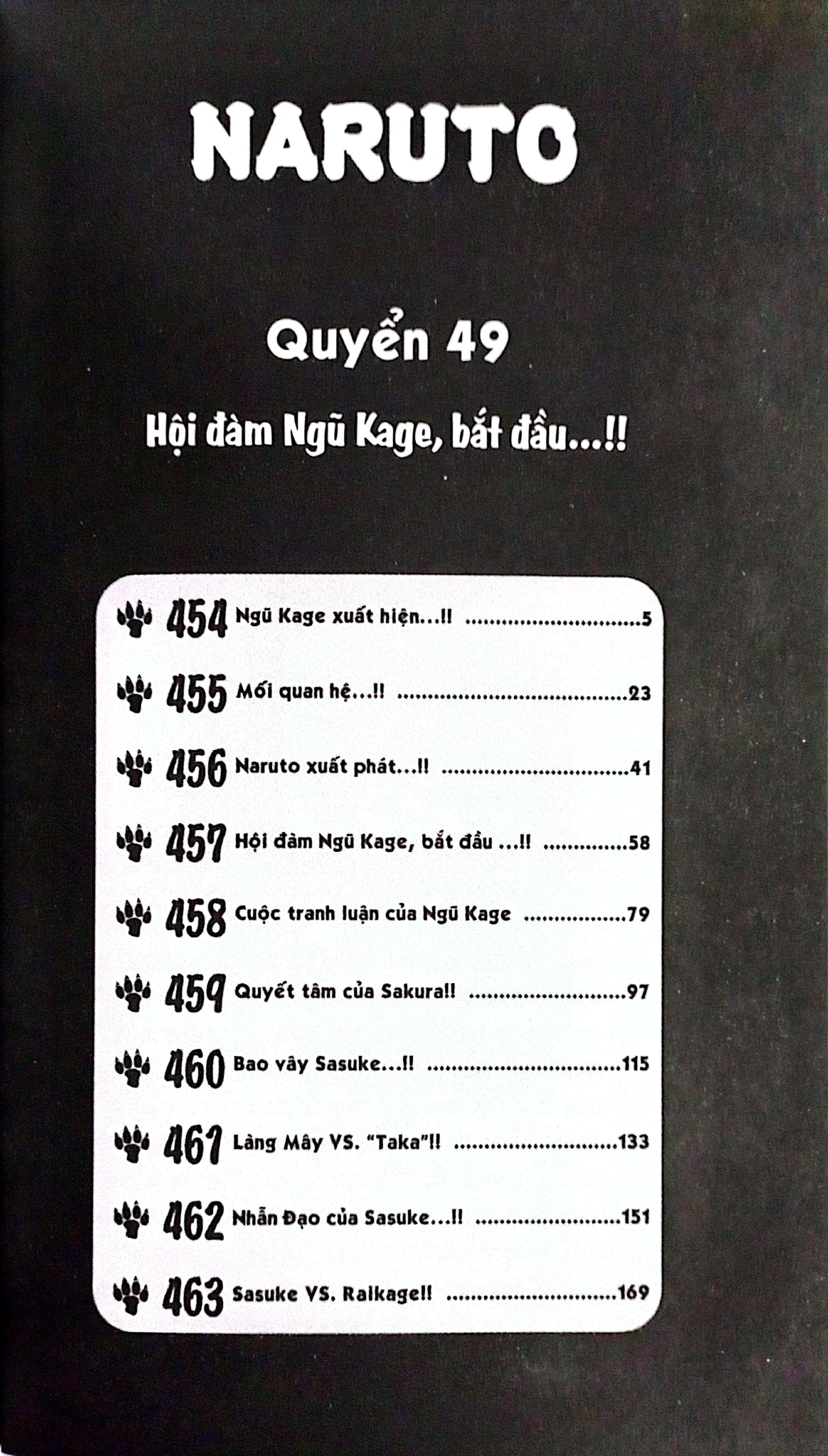 Naruto - Tập 49 - Hội Đàm Ngũ Kage, Bắt Đầu…!! Nhằm triệt hạ Akatsuki cùng mưu đồ thống trị của chúng, Hội đàm Ngũ Kage đã được tổ chức theo lời kêu gọi của Raikage. Đại diện các làng lần lượt tập trung ở Thiết Quốc! Trong lúc đó, trước chủ trương triệt hạ Sasuke của làng Mây, để thù hận không kéo theo thù hận, Naruto quyết định trực tiếp đứng ra đàm phán với Raikage…!? MASASHI KISHIMOTO “Dạo này làm việc một m.ình buồn quá, nên tôi thường mở phim lên coi. Định bụng vừa tập trung làm việc vừa lướt phim, nhưng khi nhận ra, tôi lại đang tập trung xem phim và vẽ qua loa đại khái mới chết. Kiểu này tới lúc xem trúng bộ ba phim liên hoàn thì không biết thế nào đây…” (Toát mồ hôi)